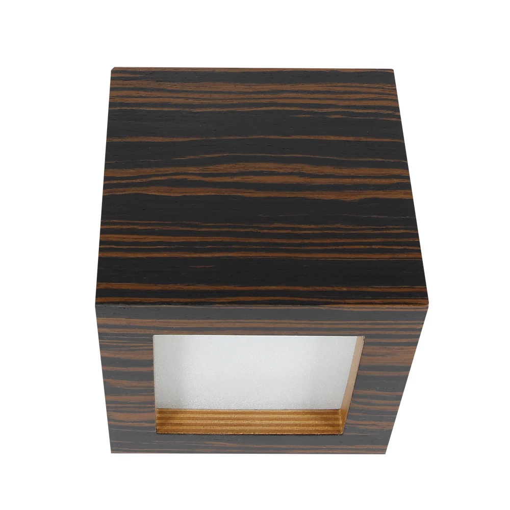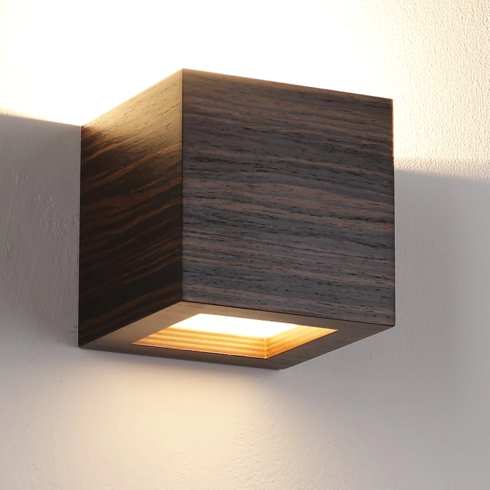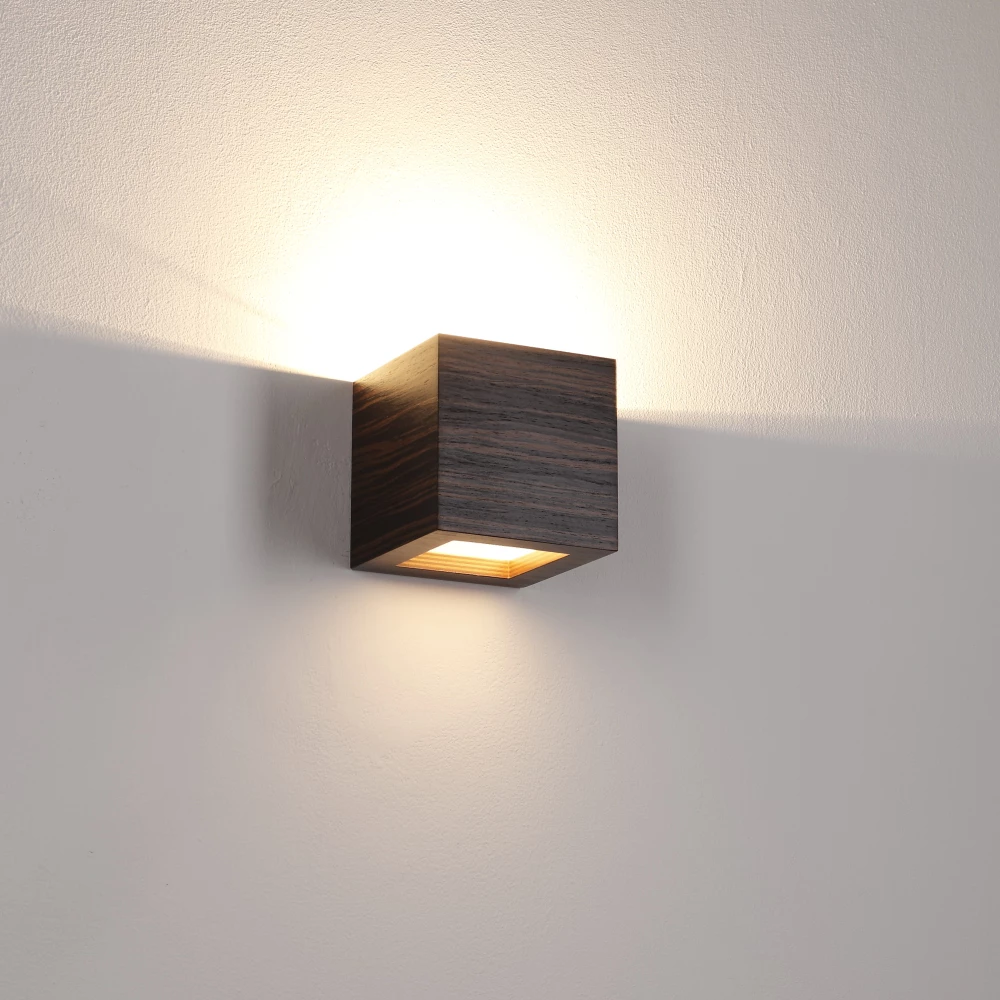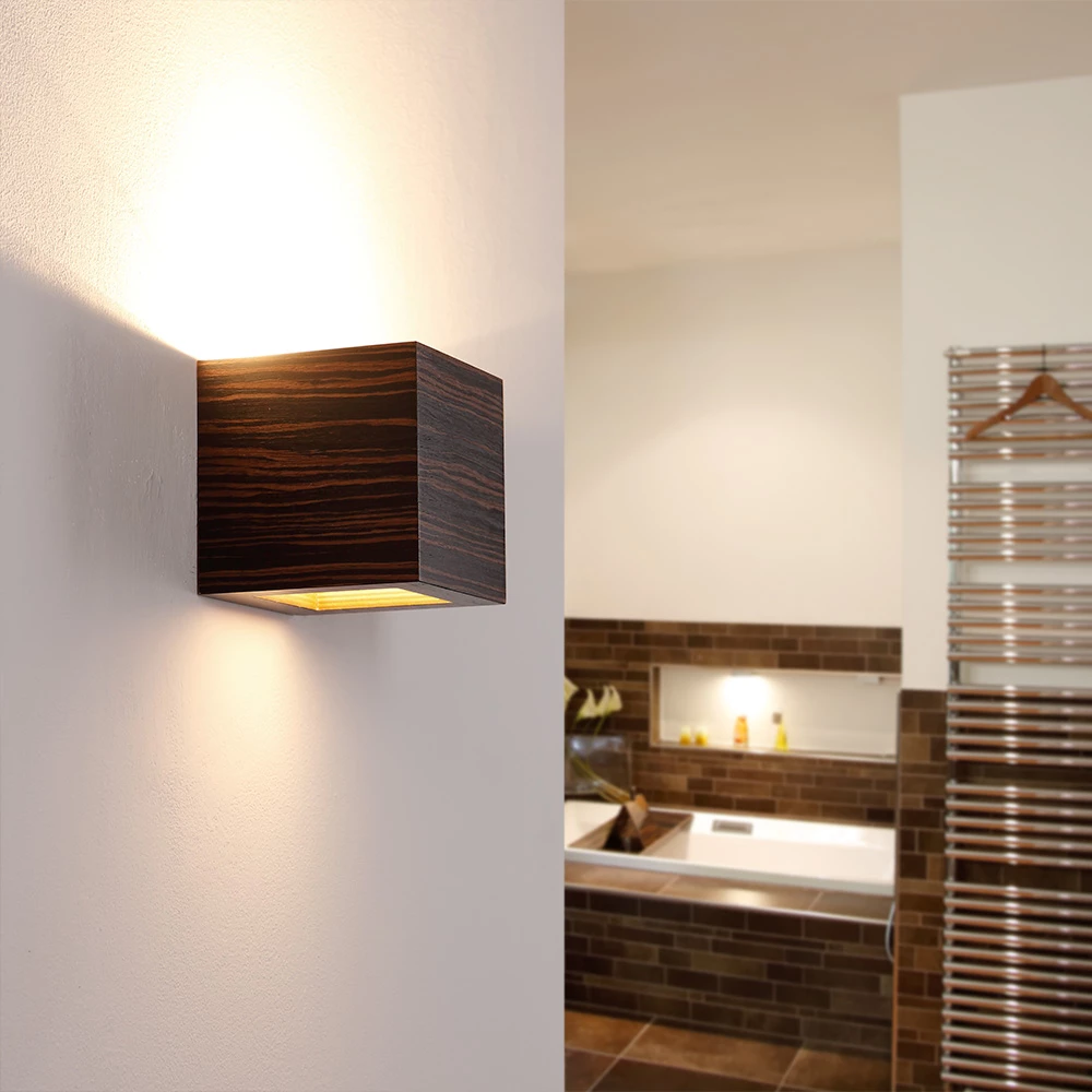Die kubische Wandleuchte begeistert mit Holzoptik durch die Funierblende in dunklem Zebrano.