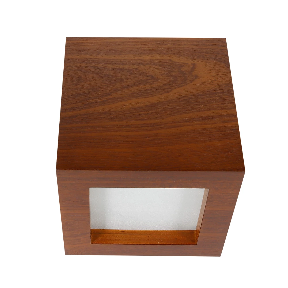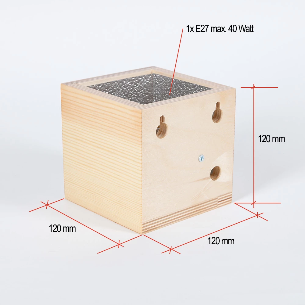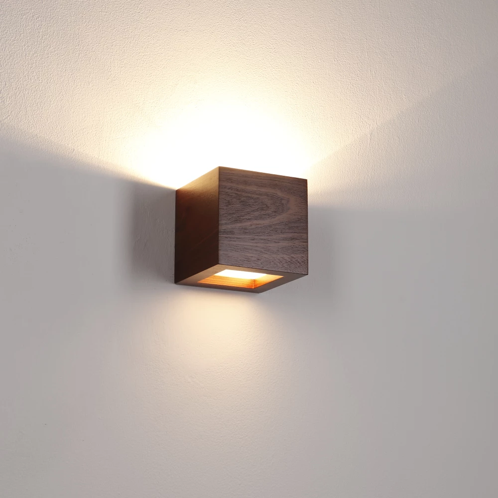 Die kubische Wandleuchte begeistert mit einer Holzfläche mit Funierblende in Meranti.