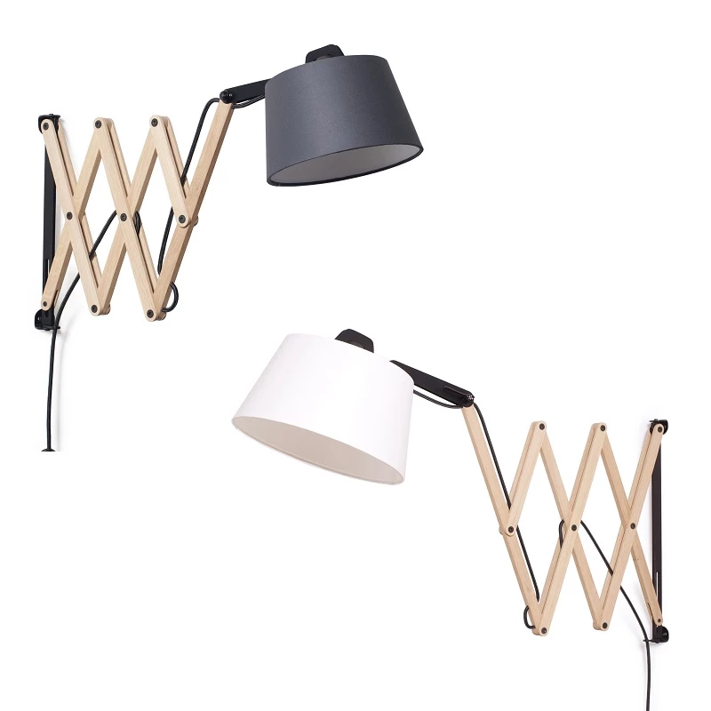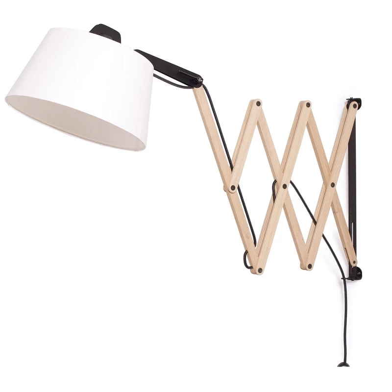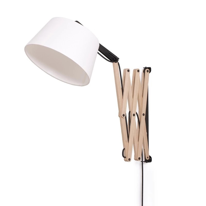 Dimmbare Scherenwandleuchte Weißeiche, Schirm wählbar