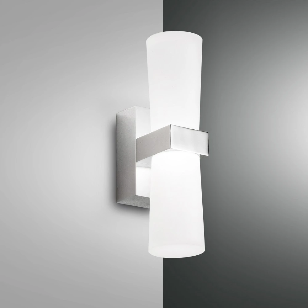 Das elegante Design der Wandlampe lässt sich mit verschiedenen Interieurs kombinieren. Das verchromte Metallgestell harmoniert hervorragend mit dem weißen Glas.