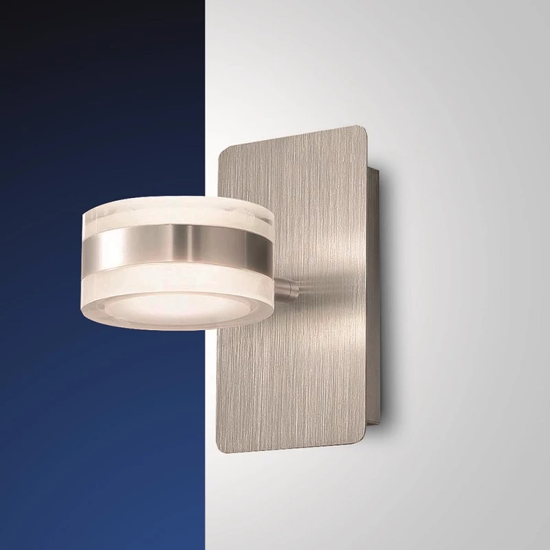 Am Leuchtenkopf sind zwei weiße Acrylglasblenden montiert, dahinter sind die beiden LED-Leuchtmittel eingelassen. Das weiße Acrylglas gibt das Licht blendfrei und in einem warmweißen Lichtschein nach oben und unten ab.
