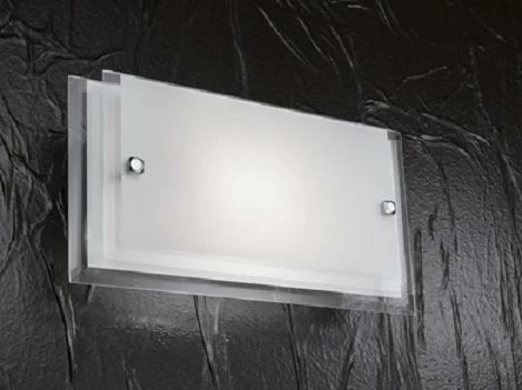 Diese Leuchte sorgt mit zwei übereinander gesetzten Glasplatten für blendfreies Licht. Ein Metallgestell und chromfarbige Stifte geben den Gläsern den nötigen Abstand. Die untere Glasplatte ist aus Klarglas, das aufgelegte Glas ist opal weiß und nur der Rand ist klar. Die gerade Form und die Anbringung der Glasplatten macht die Leuchte zum Blickfang an der Wand.
