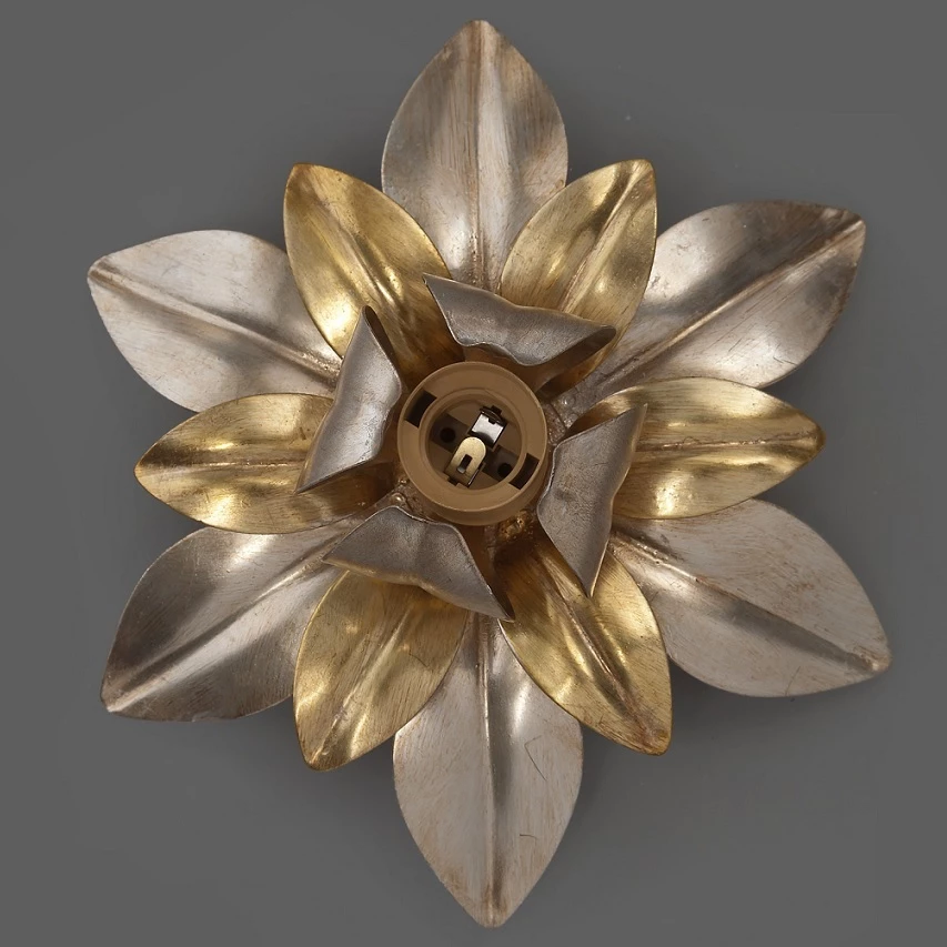 Diese Deckenleuchte orientiert sich am klassischen Florentiner Leuchtenstil. Silbernes Blattdekor mit einem zentralen Mittelpunkt, der das Leuchtmittel umschließt, prägen das Bild dieser Deckenlampe. An einigen Blättern wurde die Patina stärker aufgetragen, so entsteht der “Bicoloreffekt”.