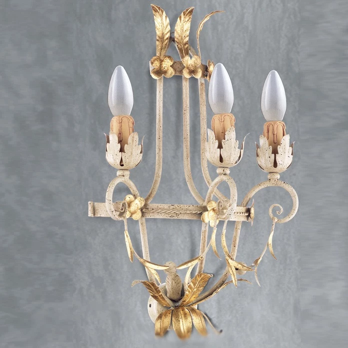 Rustikal, aufgepeppt mit filigranen Elementen in Gold. Form und Gestaltung dieser Wandleuchte orientieren sich am Landhausstil und erinnern an eine klassische Wandfackel. Der robuste Korpus aus Eisen ist durch filigrane, handbemalte Verzierungen in Gold ergänzt worden und nimmt der Leuchte ihre Schwere. Die Farbgestaltung in Antikweiss und Gold gibt der Wandleuchte eine exquisite Note. Die Wandleuchte ist sowohl handgefertigt, als auch handbemalt und wird zur stilvollen Zusatzbeleuchtung in Wohn-, Ess- und Schafzimmern. Perfekt geeignet ist sie ebenso als Flur- oder Treppenhausbeleuchtung.