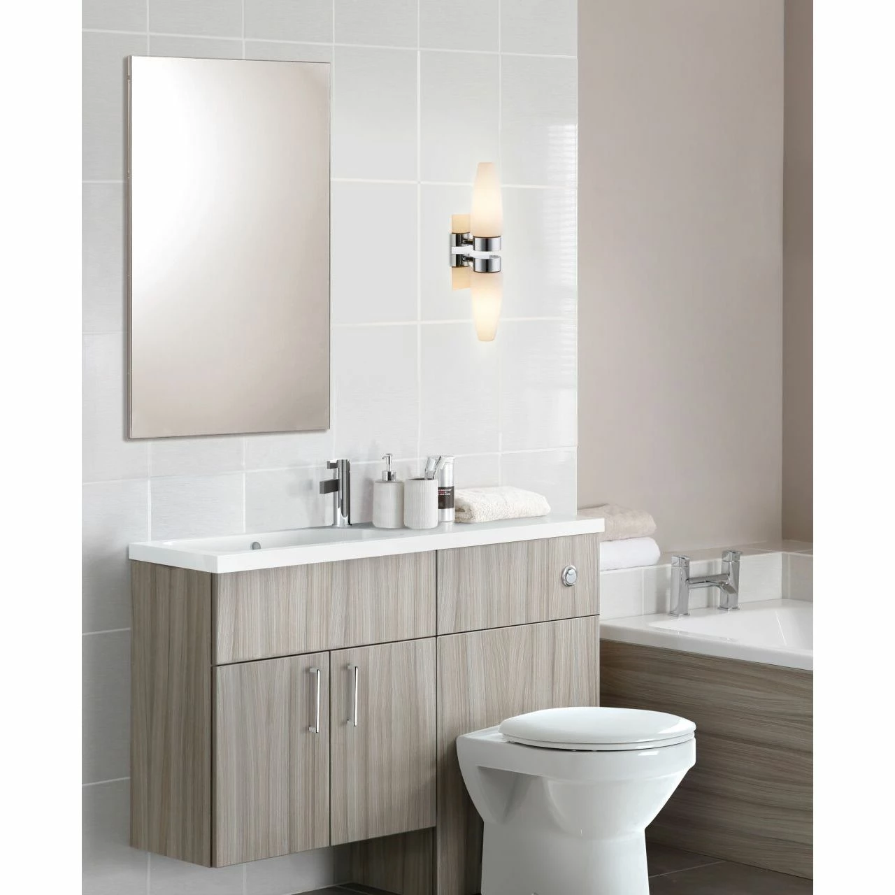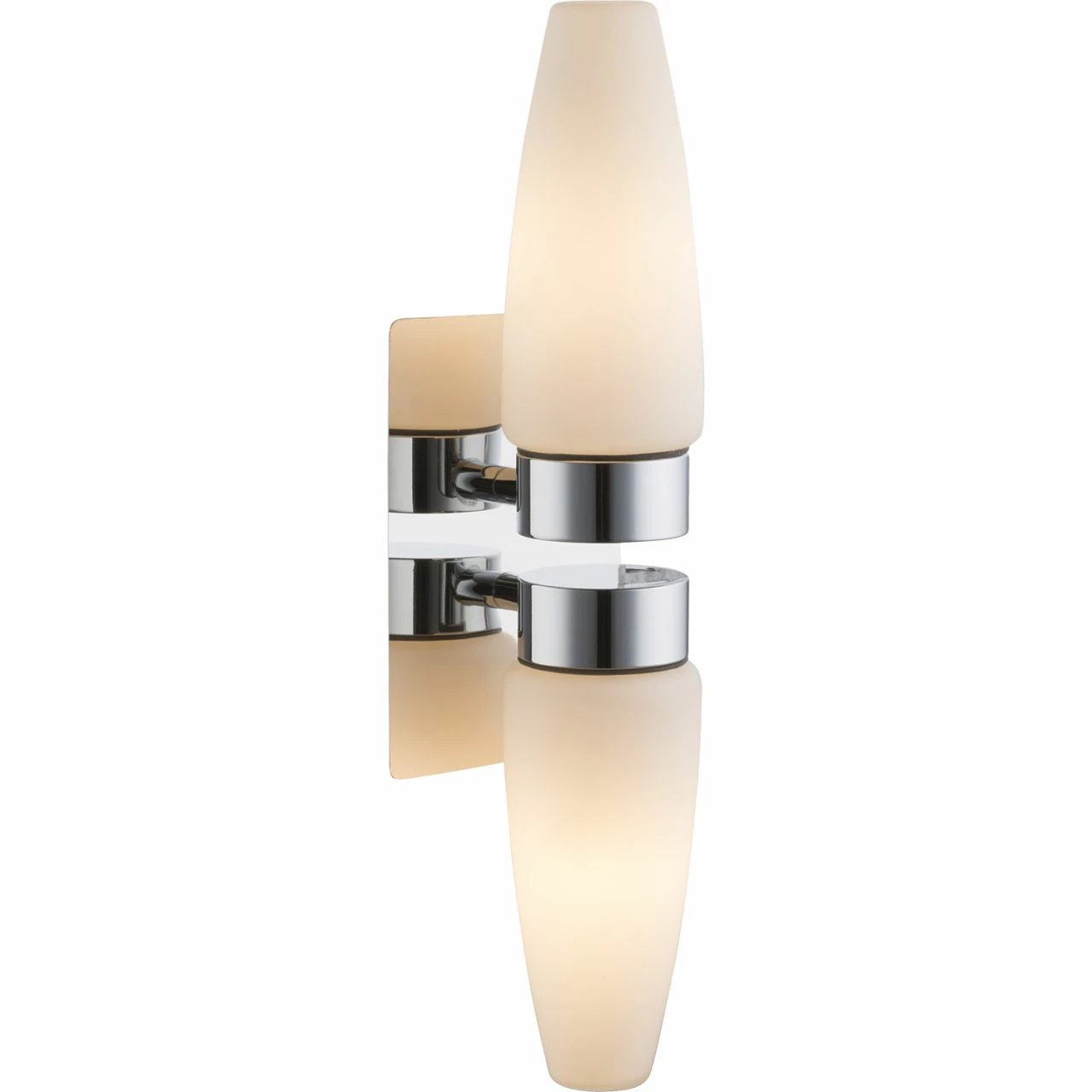 Diese 35 cm große Wandlampe, aus der Serie, zeichnet sich durch ihre Schutzart IP44, welche gegen Spritzwasser schützt, aus. Bei der Anfertigung dieser verchromten Lampe wurden Edelstahl in Silbergrau als Basis und weißes Opalglas, zur Abdeckung der LEDs gewählt. Der Strahler setzt einen eleganten Akzent und leuchtet auf- und abwärts. Zwei E14 Fassungen bieten Ihnen, bei max. 25W pro Fassung, die Auswahl des passenden Leuchtmittels, um die Helligkeit und Lichtfarbe selbst zu bestimmen. Aufgrund ihrer Stromersparnis und Langlebigkeit, empfehlen wir LED-Lampen. Des Weiteren lässt sich diese Lampe gut mit anderen Modellen aus dieser Serie kombinieren.
