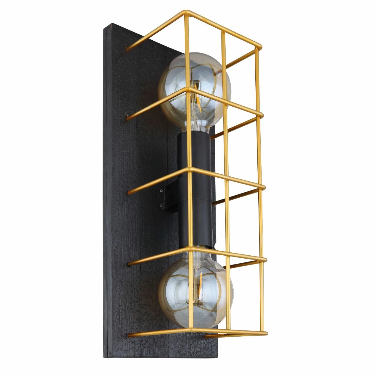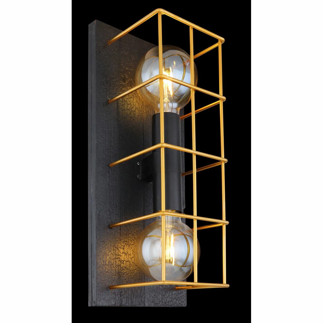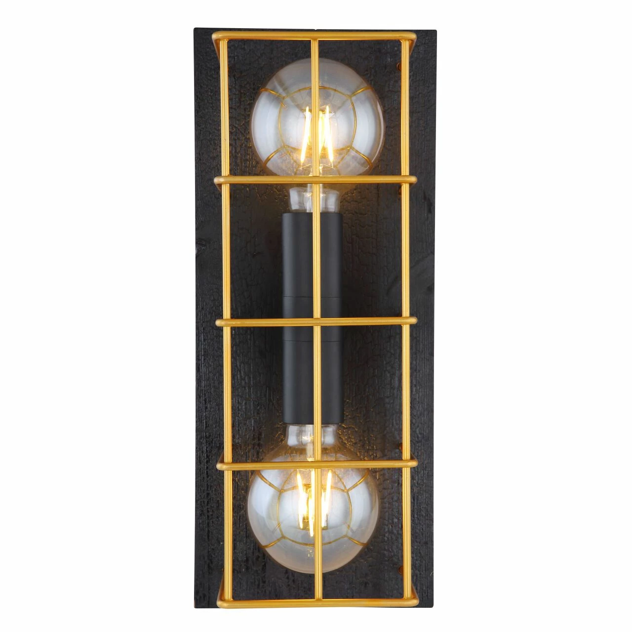 Wandleuchte Metall schwarz, Holz schwarz, Metall goldfarben, Käfig aus Betonstahl-Gitter, geflammtes Holz, BxH:182×430, AL:165, exkl. 2xE27 60W 230V