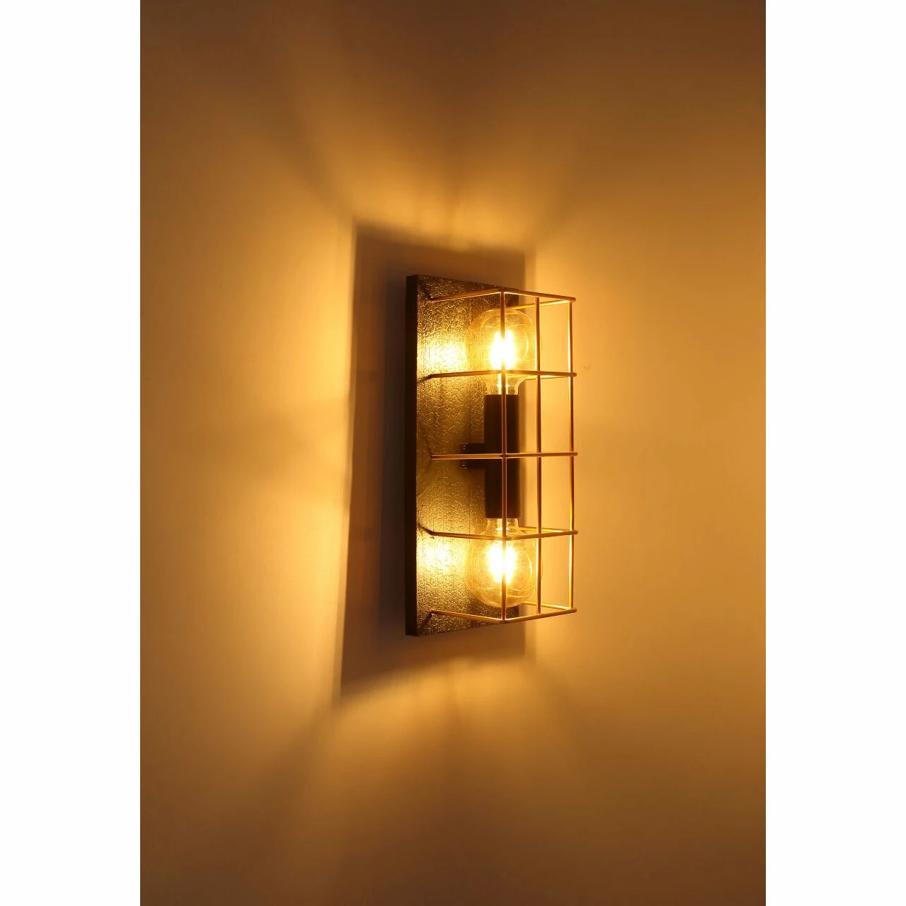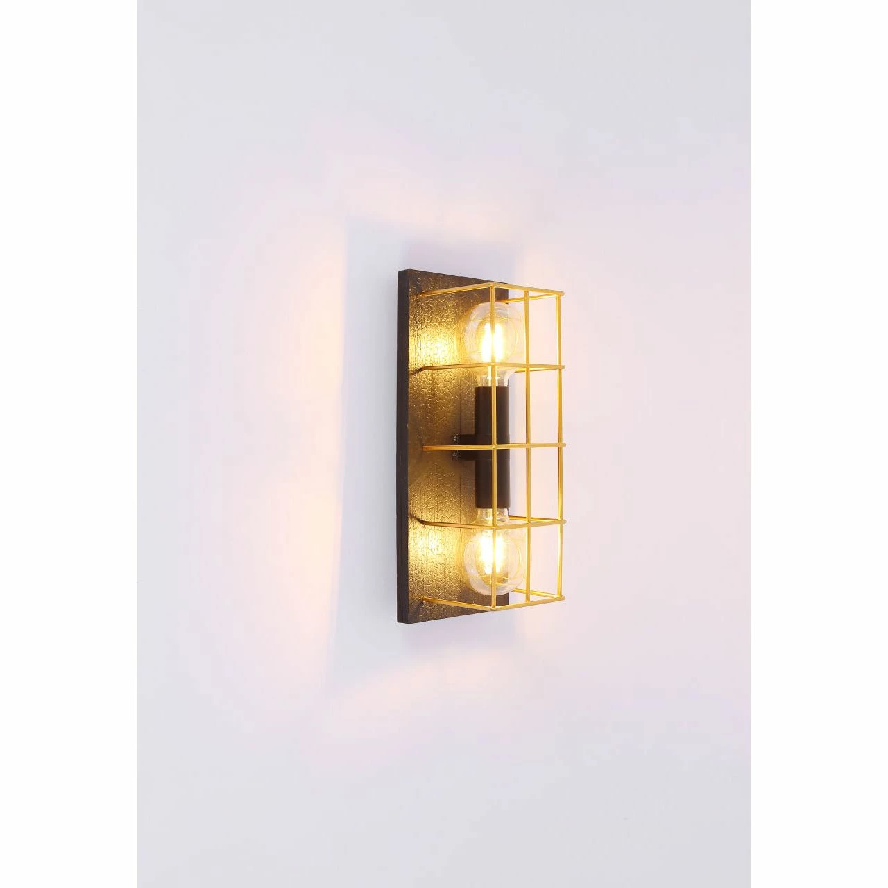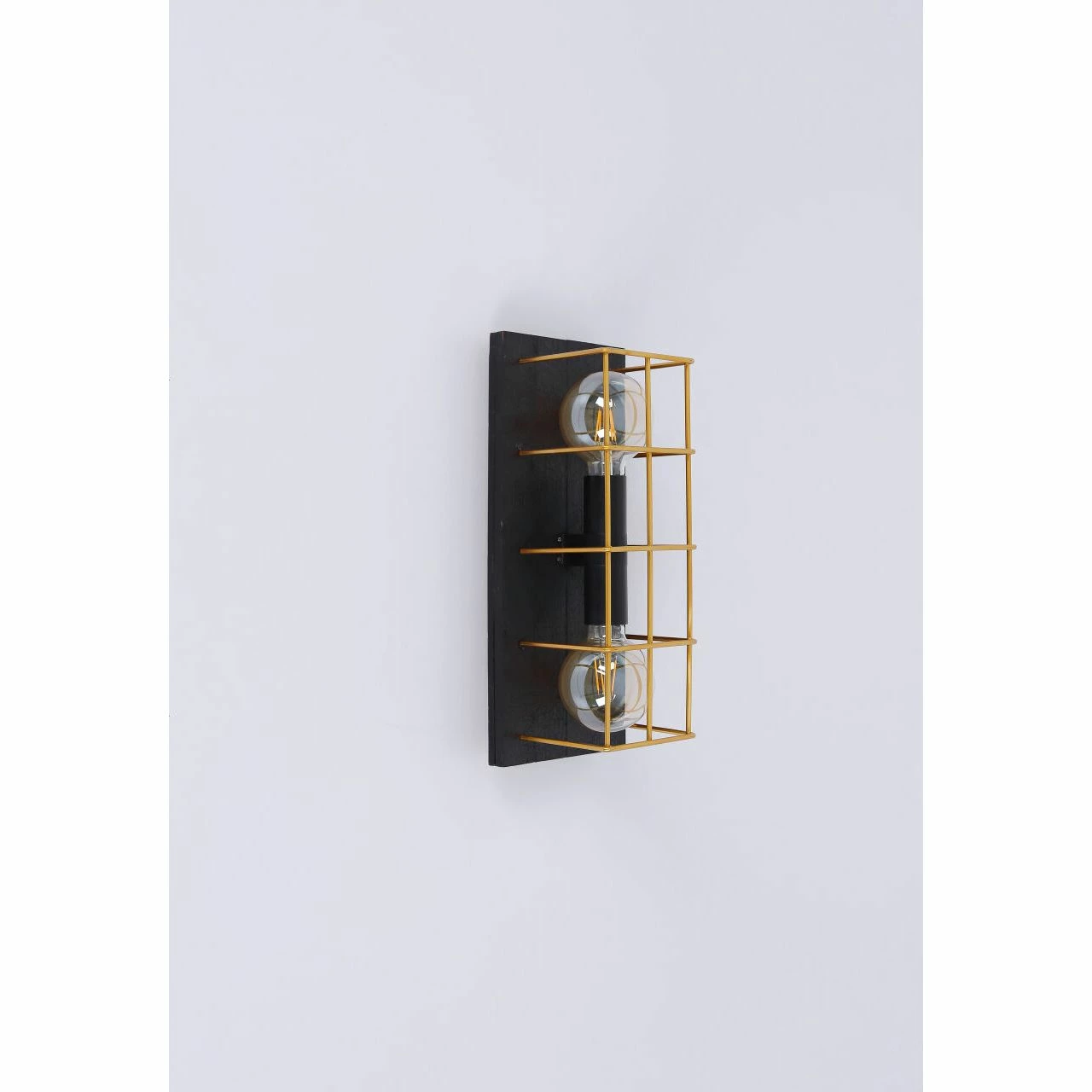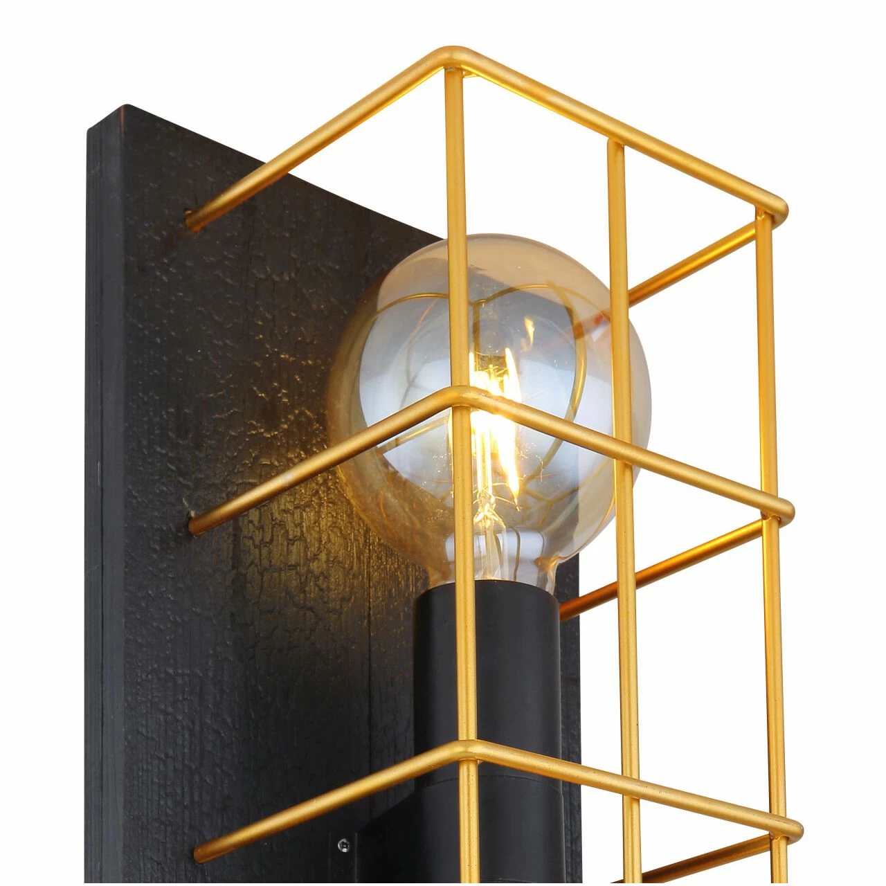 Wandleuchte Metall schwarz, Holz schwarz, Metall goldfarben, Käfig aus Betonstahl-Gitter, geflammtes Holz, BxH:182×430, AL:165, exkl. 2xE27 60W 230V