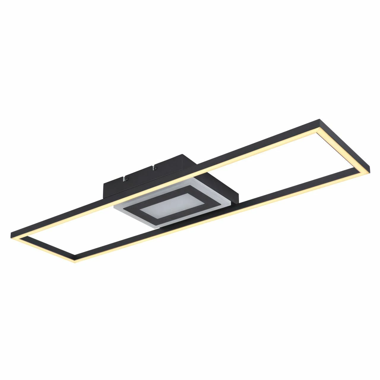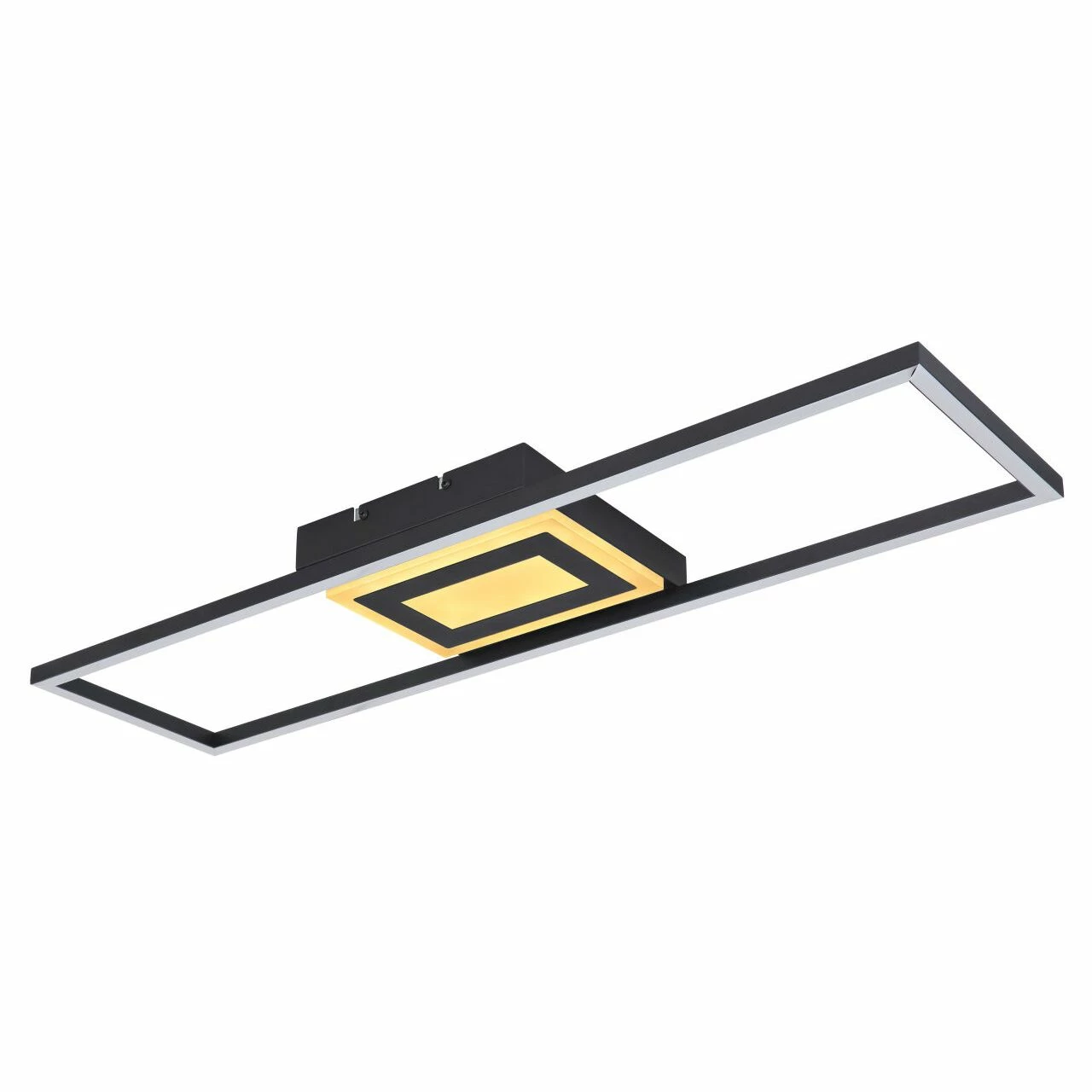 Diese Deckenlampe aus der-Serie ist eine wundervolle Ergänzung für Ihre Innenräume. Die 81 cm lange Deckenleuchte besteht aus einem schwarzen rechteckigen Metallrahmen, der mit opalenem Acryl versehen und an einem schwarzen Metallquader fixiert ist. Die Fläche des Quaders innerhalb des Rahmens kann separat beleuchtet werden und ist ebenfalls mit opalenem Acryl versehen, welches jedoch formschön durch das schwarze Metall unterteilt wird. Mit den inkludierten LED-Leuchtmitteln leistet die Deckenlampe 1100 Lumen starkes Licht bei einer angenehmen Lichtfarbe von 3000 Kelvin (warmweiß). Durch weitere Modelle der gleichen Serie können Sie das Gesamtbild in Ihren vier Wänden komplettieren und für ein stilvolles Ambiente sorgen.