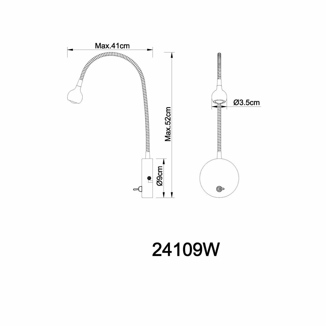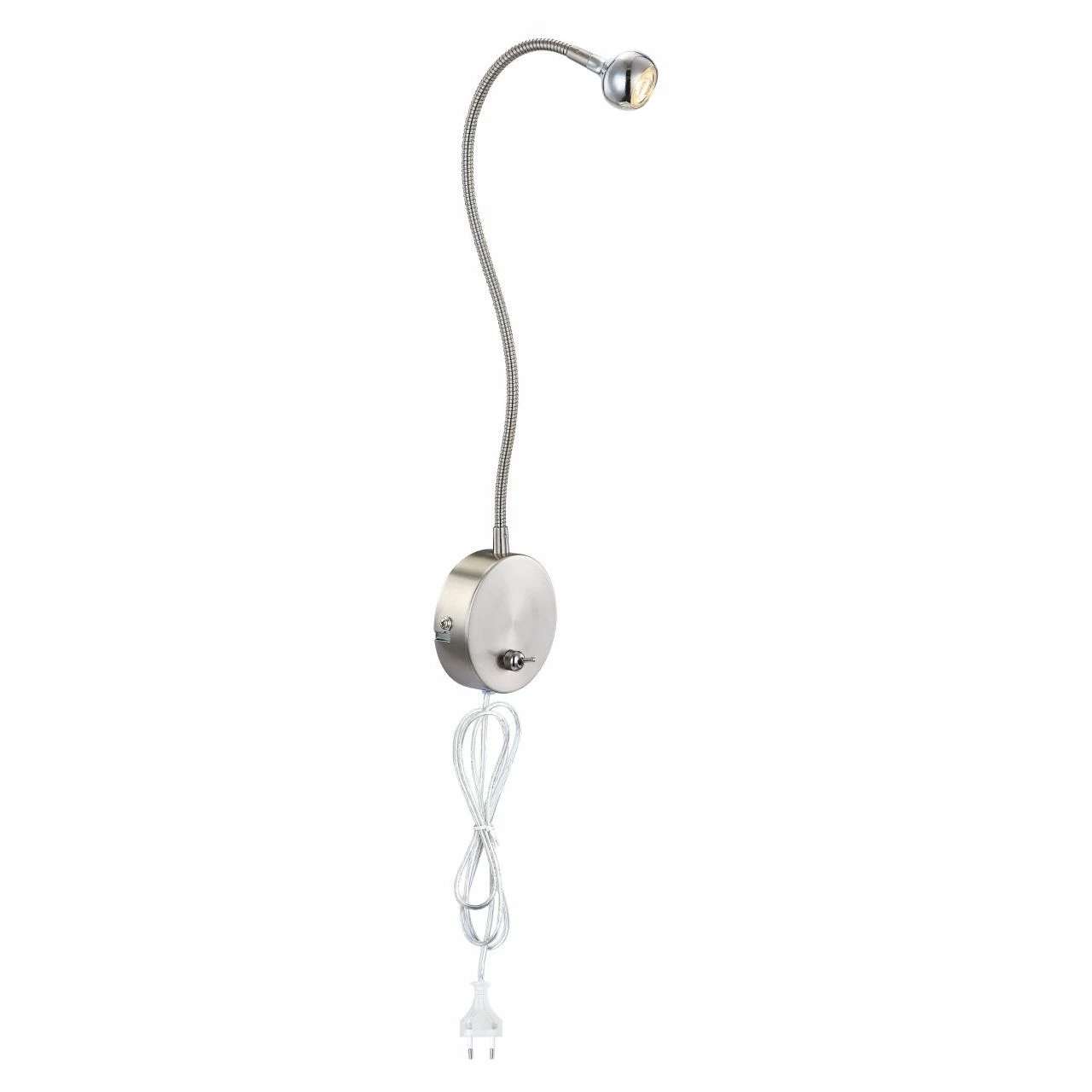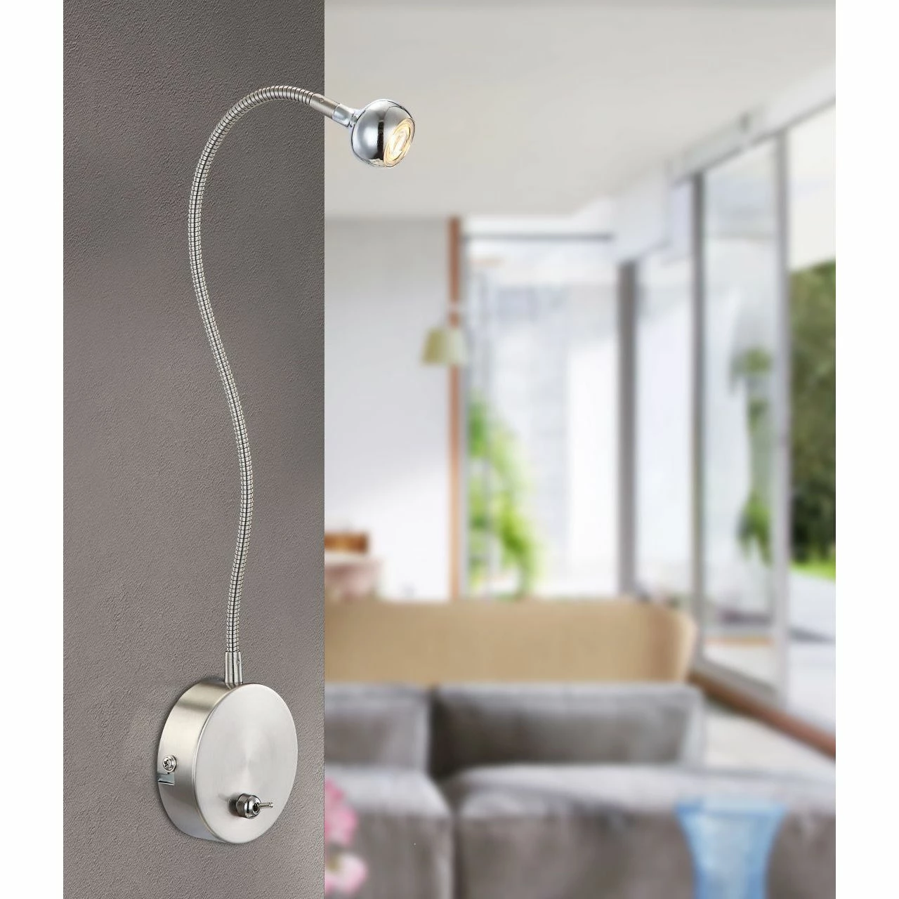 Diese Wandlampe ist sehr schlicht, dennoch macht sie ihr Äußeres sehr interessant. An der nickel matten Armatur befindet sich ein langer flexibler Arm, an dessen Ende ein kleiner verchromter Strahler zu finden ist. Dieser erstrahlt in einem 150 Lumen starken und 3000K warmweißen Licht. Zu der Ausstattung der 42 cm großen Lampe gehören ein transparentes Netzkabel und ein Schalter.