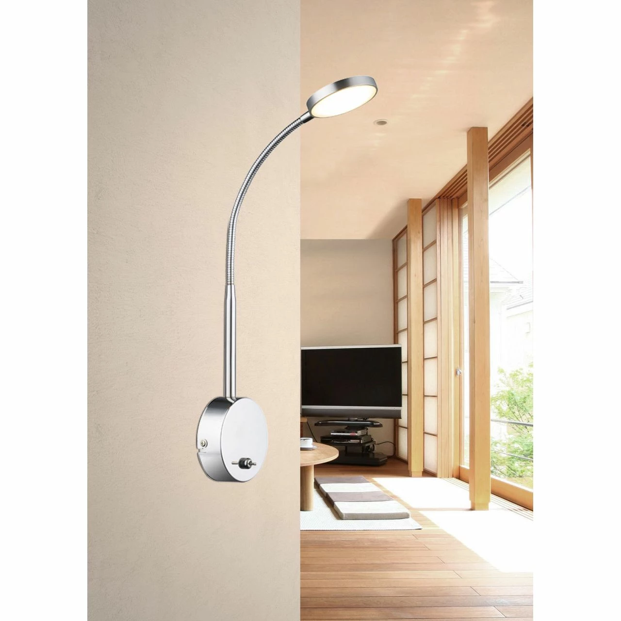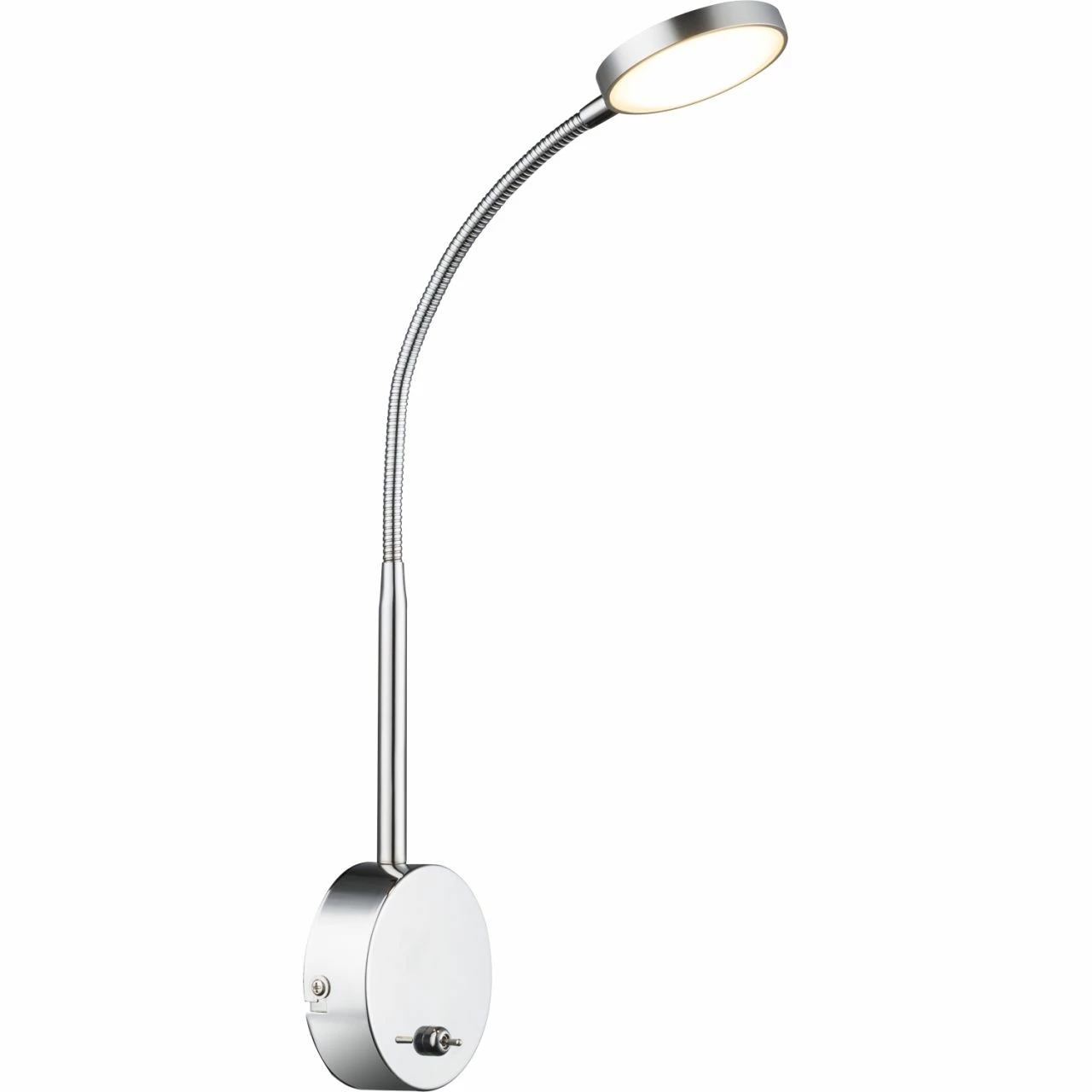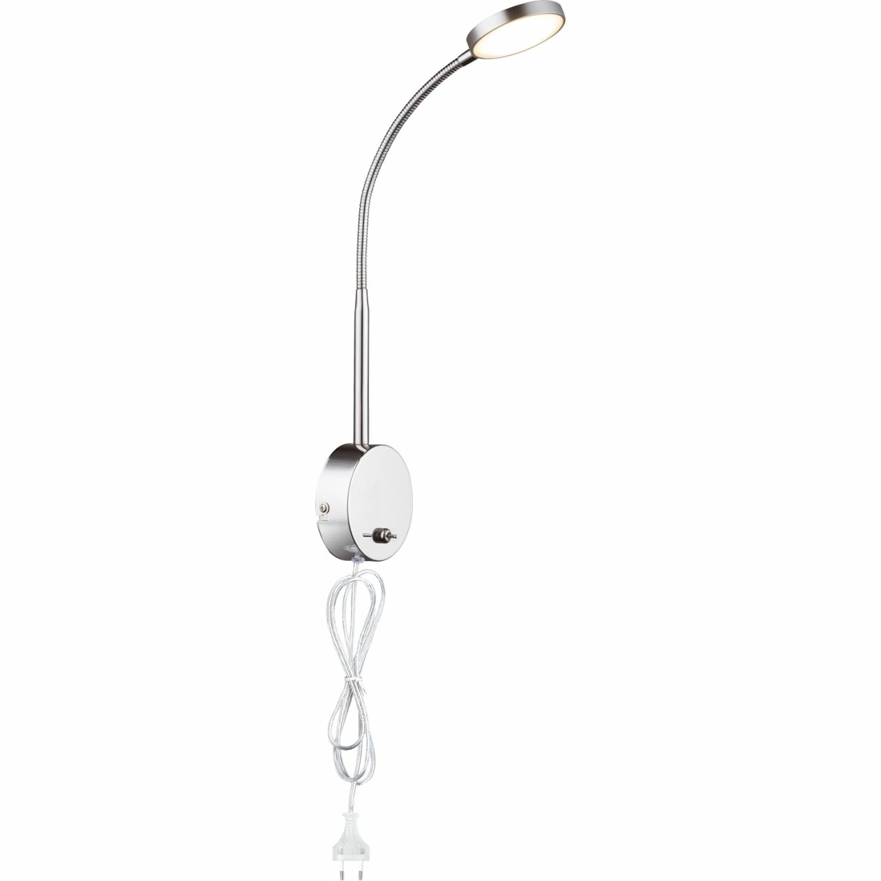Mit dieser schlichten aber dennoch eleganten Lampe können Sie angenehme Akzente setzen. Am Ende eines verchromten Aluminumarmes befindet sich ein flacher Strahler, welcher durch satiniertes Glas ein 450 Lumen starkes und 3000K warmweißes Licht ausstrahlt. Zudem besitzt die 51 cm große Lampe ein 150 cm langes transparentes Kabel mit Stecker und Schalter.