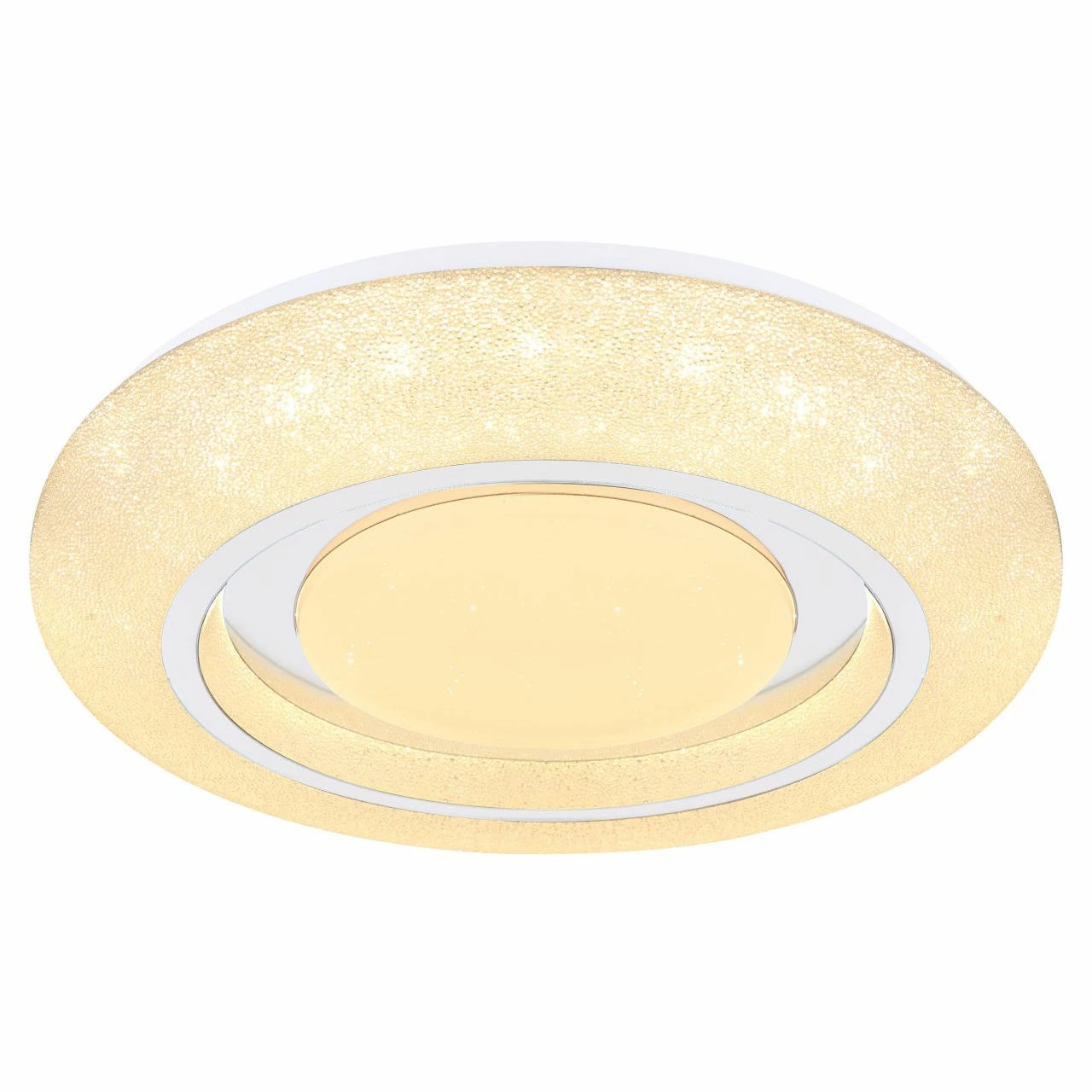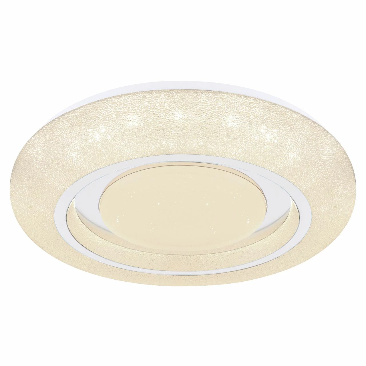 Die runde Deckenleuchte aus weißem Metall hat einen Acrylschirm in opal und dieser wird durch einen Chromring unterbrochen. Die glitzernde Lampe ist 7 cm hoch und hat einen Durchmesser von 38 cm. Das inkludierte LED-Leuchtmittel beleuchtet Ihr Wohnzimmer, Ihren Flur bzw. Ihre Diele, Ihr Esszimmer, Ihr Schlaf- bzw. Kinderzimmer mit 1560 Lumen und die Lichtfarbe ist über den Wandschalter zwischen drei Stufen wählbar. Sie können die Lichtfarbe in warmweiß (3000 Kelvin), kaltweiß (4000 Kelvin) oder tageslichtweiß (6000 Kelvin) fixieren. Mit dieser Deckenlampe bringen Sie moderne Eleganz in Ihr Zuhause.