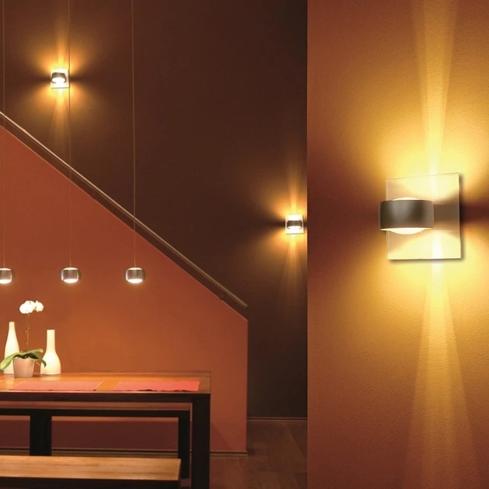 Die Leuchte fasziniert durch ein dekoratives, indirektes Lichtspiel für eine lebendige Atmosphäre. Das außergewöhnliche Wandbild des Lichtspiels, wird durch zwei satinierte Glaslinsen, welche einen klaren Streifen in der Mitte haben erzeugt. In reinem weiß und edlem silber ist diese Wandleuchte ein Highlight für Ihren Wohnbereich. Wir bieten Ihnen die Leuchte in 10 Ausführungen an.