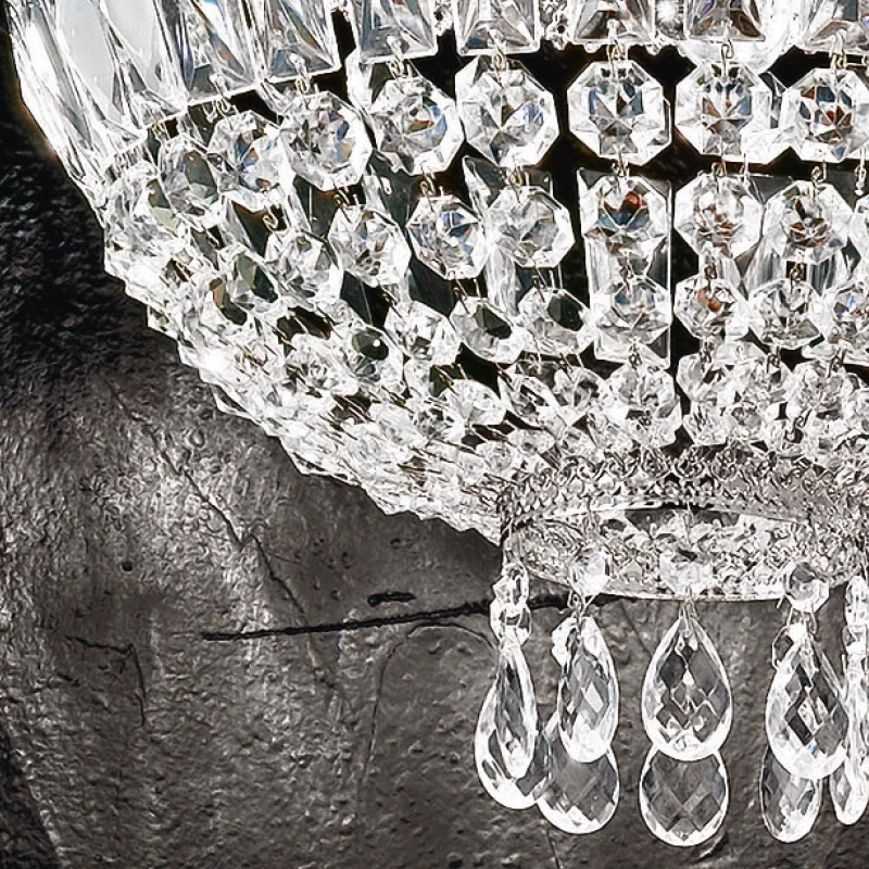 Gehalten wird der erlesene Glasbehang von einem Rahmen aus glänzendem Nickel, welcher mit dekorativen Elementen verziert wurde. Glitzernd voller Eleganz zieht diese Leuchte Blicke magisch an.