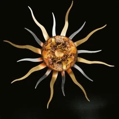 Filigrane Elemente aus Blattgold und Blattsilber lassen die Sonne erstrahlen. Hinter der goldenen Blende verbirgt sich eine Fassung für maximal 40W G9 Halogenlampen.