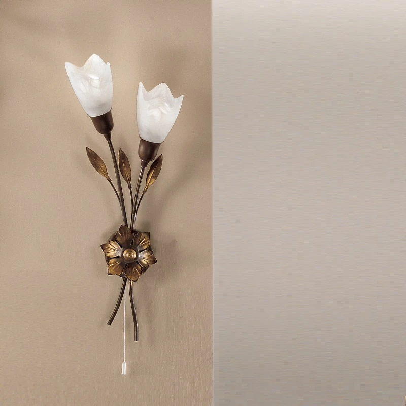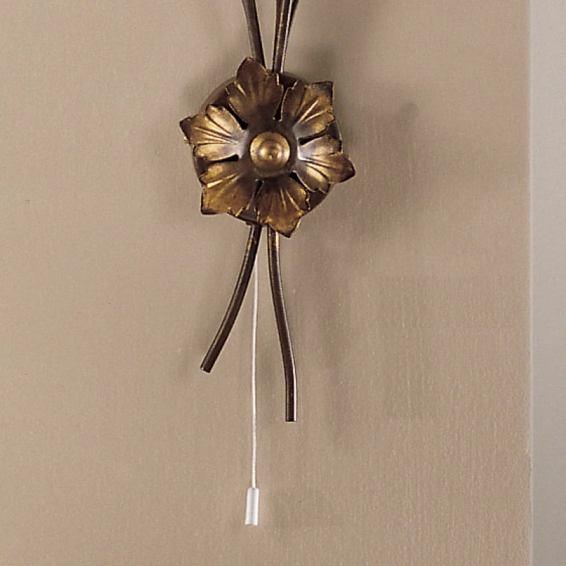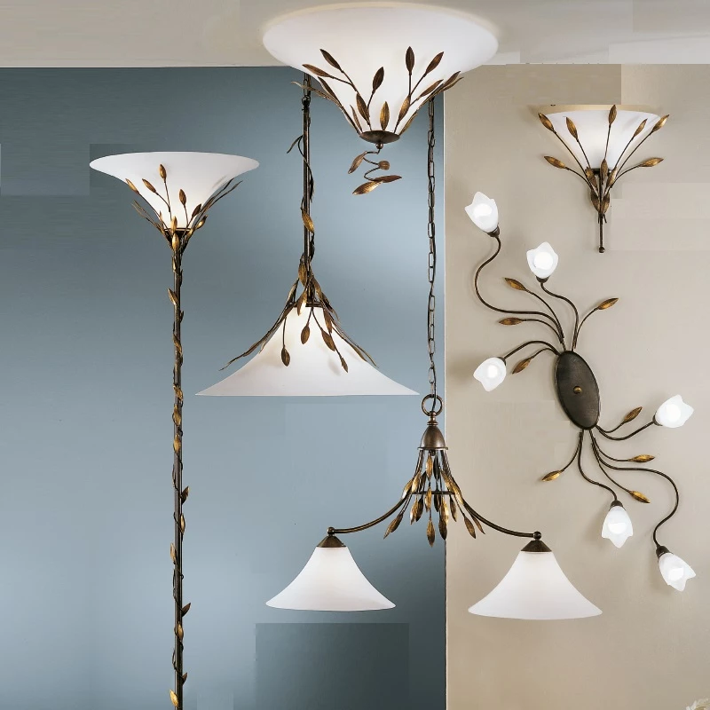 schmückt diese stilvolle Leuchtenserie und verleiht ihr Exclusivität. Die zierlichen Blätter sind gold patiniert und harmonieren ansprechend mit den Gestellen in antiker Rostoptik. Für blendfreies, wohnliches Licht sind die Leuchten mit zarten Glaskörpern ausgestattet.