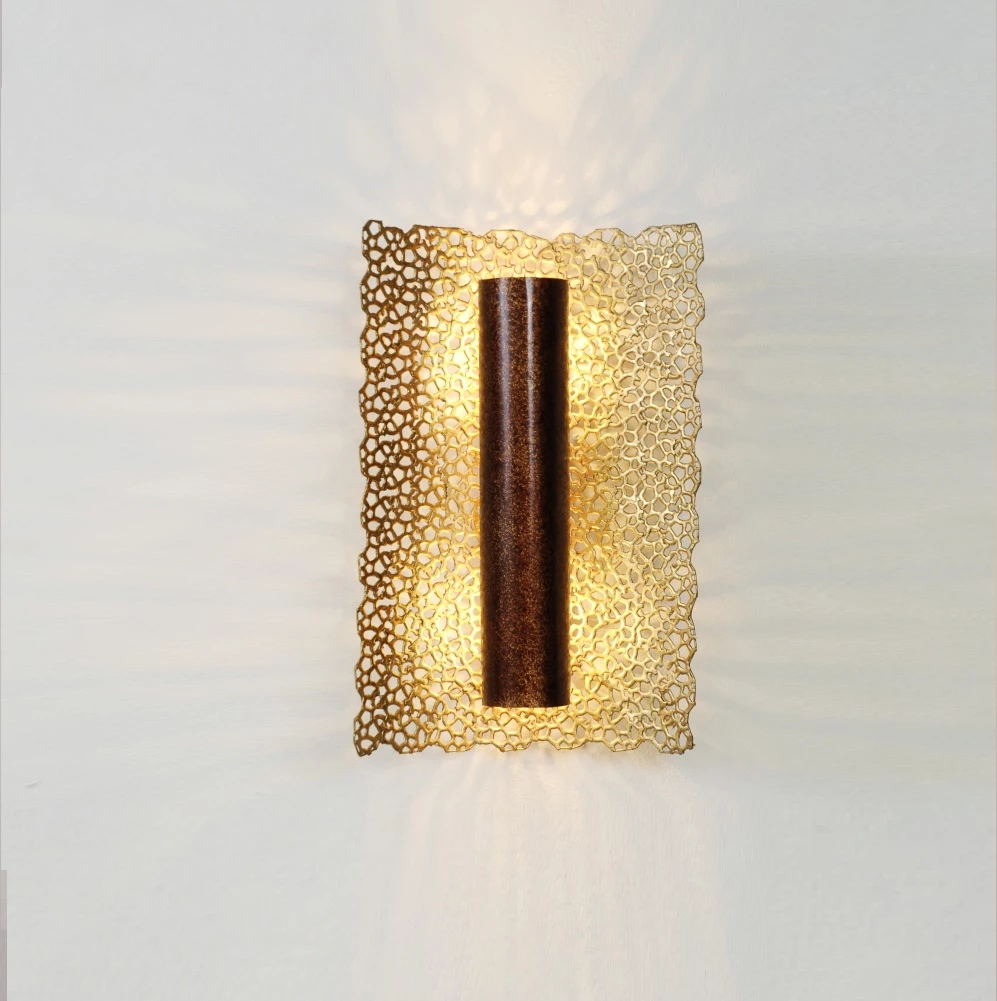 Das rechteckige filigrane Metallnetz bildet den Hintergrund und die Auflage für die Leuchte selbst, die sich in einem Zylinder versteckt. Durch das Netzwerk entsteht ein tolles Lichtspiel an der Wand und erzeugt ein ganz eigenes Ambiente.