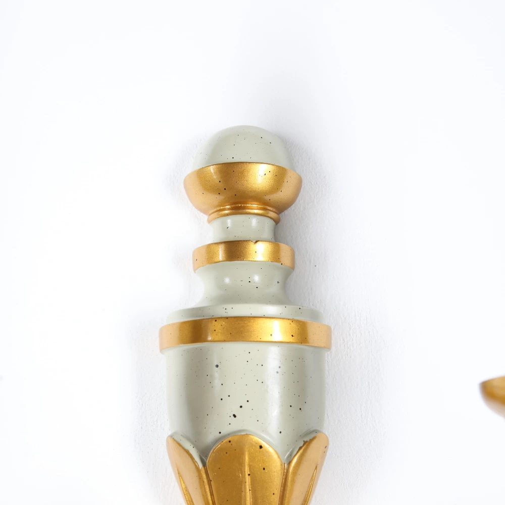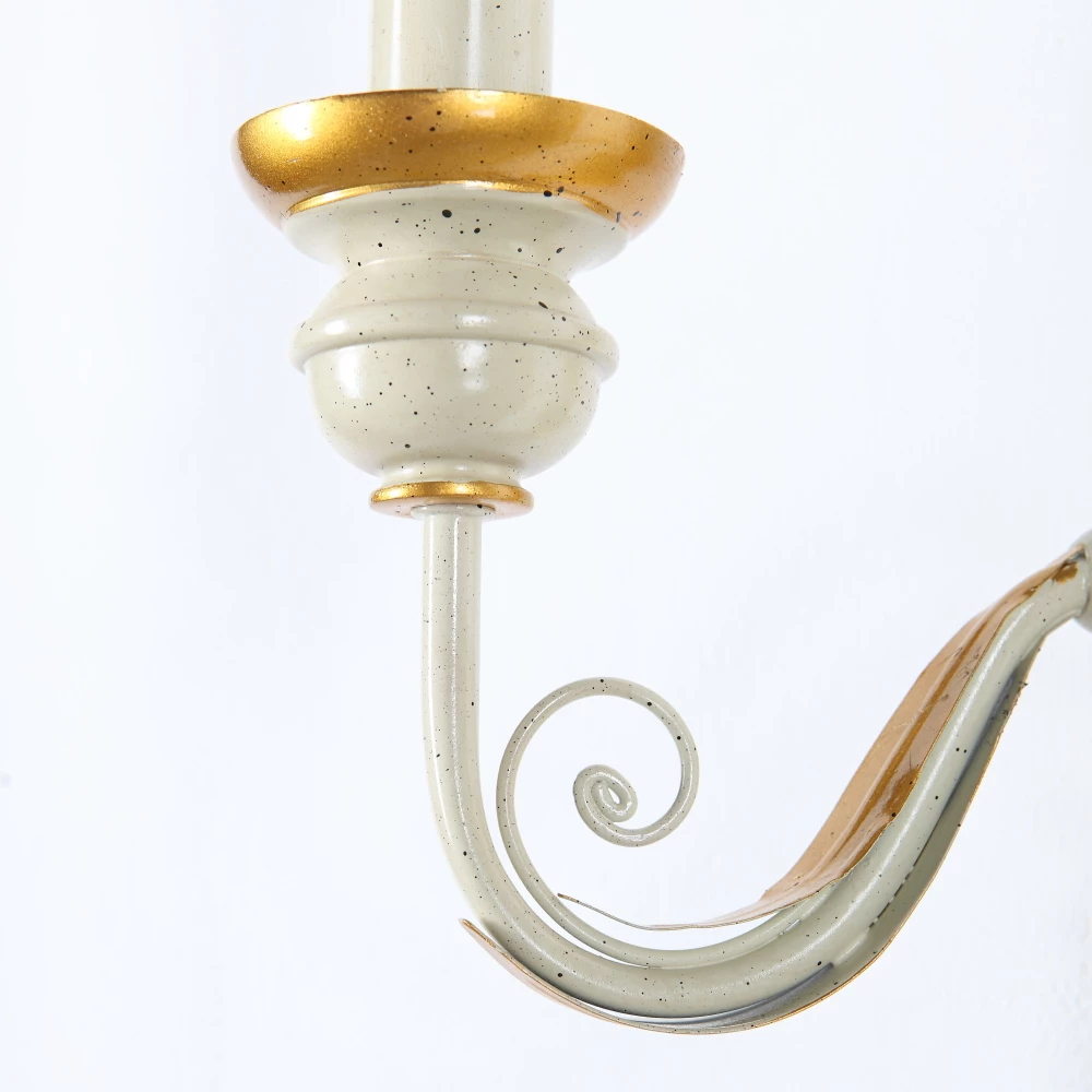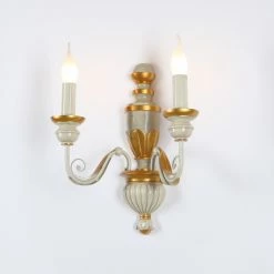 Der Korpus der Leuchte wurde aus Harz hergestellt und bekam eine antik wirkende Oberfläche in Altweiß. Einzelne Elemente der Leuchte wurden in Handarbeit mit Blattgold veredelt.