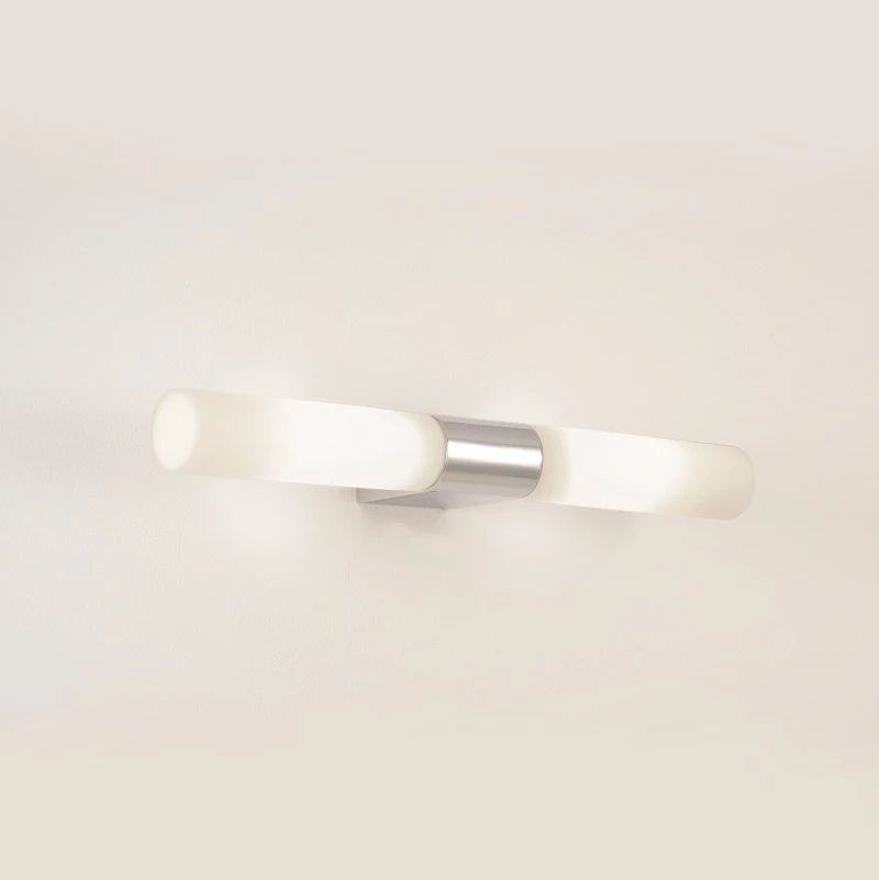 Ihr Spiegelbild wird mit dieser modernen Wandleuchte optimal ins rechte Licht gerückt. Sie bewirkt durch die Halogenleuchtmittel, die sich hinter dem weißen Röhrenglas befinden, einen gleichmäßigen und hellen Lichtschein. Das Licht verteilt sich gut, ohne zu blenden.