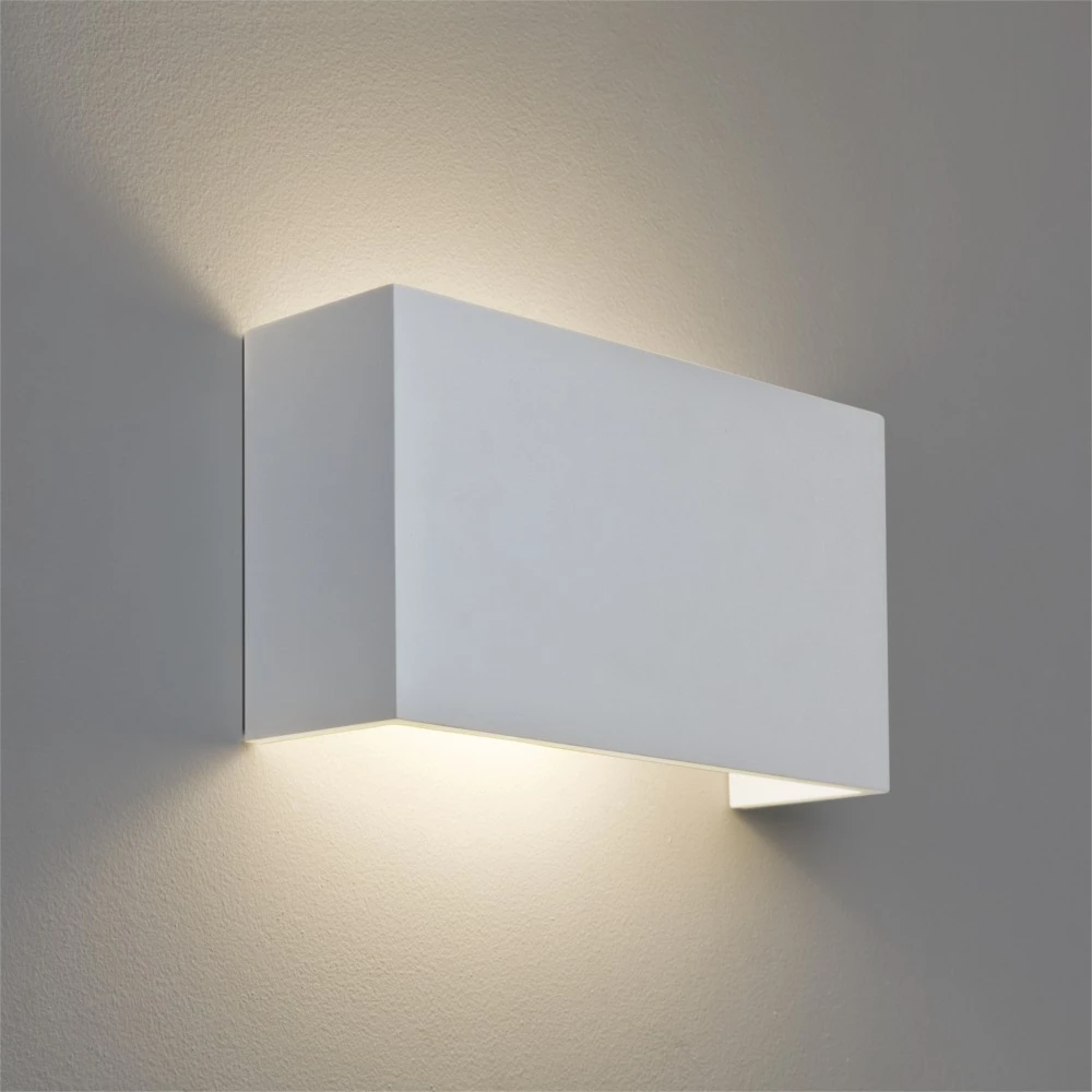 Die Wandleuchte aus Gips präsentiert sich im schlichten, zeitlosen Design und überzeugt dennoch durch ihre Erscheinung