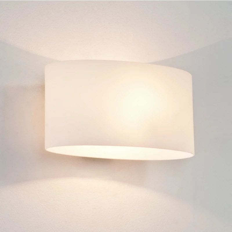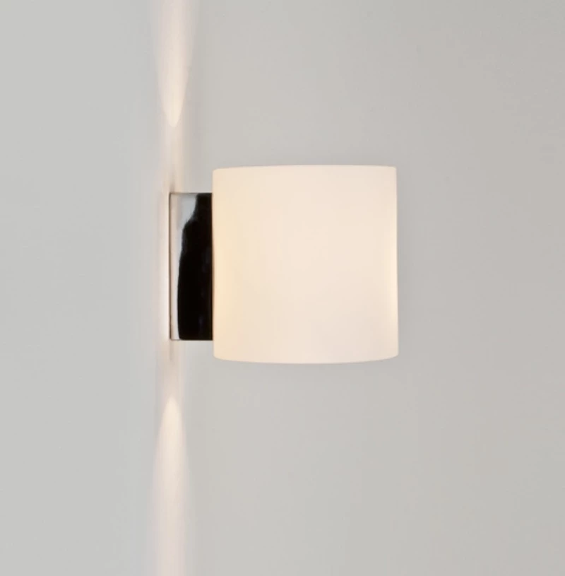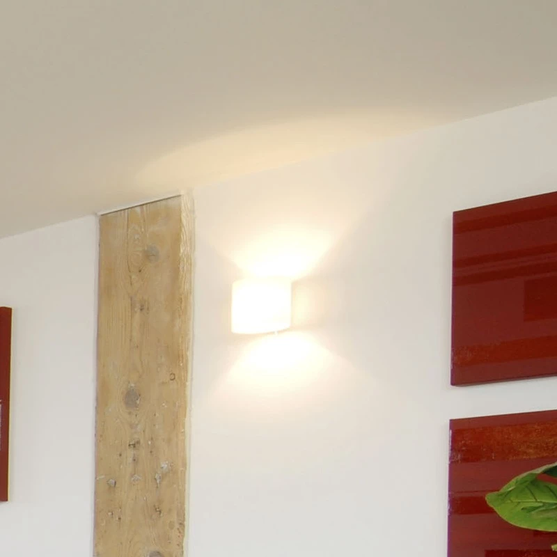 Sie besteht hauptsächlich aus einem weißen Glas, welches an einer verchromten Halterung festgemacht wird. Das Glas ist oben und unten geöffnet, sodass das Licht, neben dem diffusen Raumlicht einen kegelförmigen Lichtaustritt erzeugt, der die Wand schön beleuchtet.