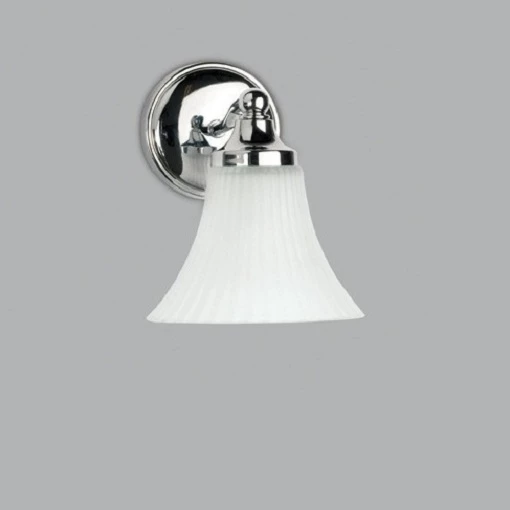 Das Design dieser Wandleuchte erinnert etwas an nostalgische Formen. Der verspielte Lampenschirm aus geriffeltem Glas passt wunderbar zu dem gebogenen Leuchtenarm und verbindet Nostalgie und Moderne.