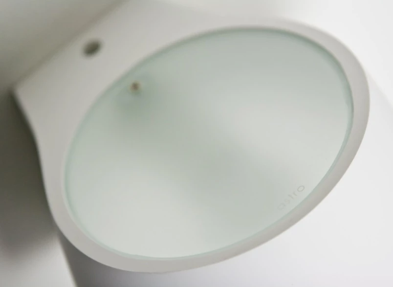 Der rundliche Korpus kaschiert im Inneren das Leuchtmittel und schließt ober- und unterhalb an den Öffnungen mit einem satinierten Glas ab, sodass das Licht gleichmäßig und blendfrei verstreut wird.
