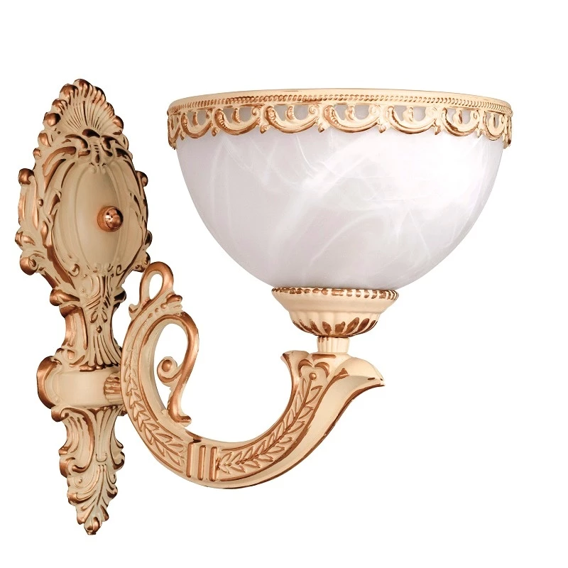 Klassische Wandleuchte aus Metall in messingfarben und antik weiß, Schirm aus Glas mit Marmor-Optik
