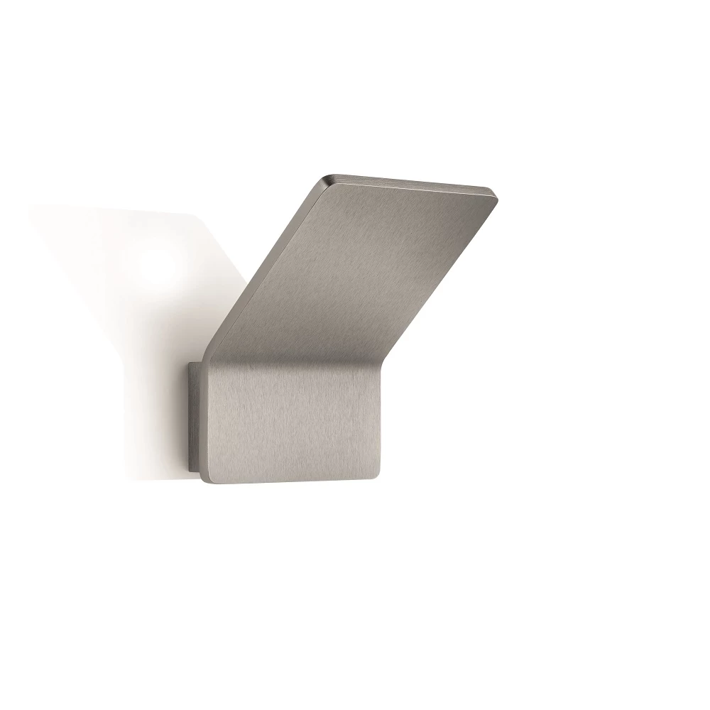 Die minimalistische Wandleuchte überzeugt durch ihre extrem flache Bauweise. Ein abgeschrägtes Rechteck fungiert als Lampenschirm und strahlt das ausgehende Licht an die Wand.