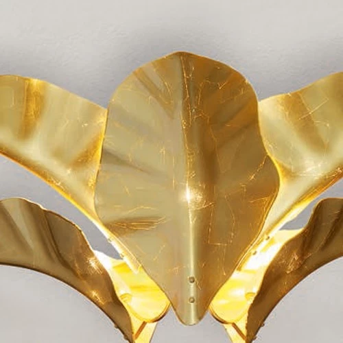 Die Metallelemente der Leuchte erhalten Sie in Silber-antik oder 24 Karat Gold-antik. Dazu gesellen sich einzigartig gestaltete Gläser, die Blatt für Blatt die Leuchtmittel verbergen und für kreative Lichtauslässe sorgen. Die Gläser erhalten Sie in glänzendem Weiß sowie mit Gold- oder Silberfolie beschichtet.