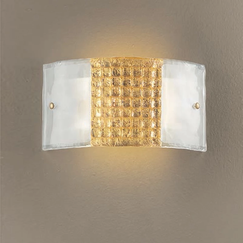 Stilvolle Wandleuchte aus Glas mit goldenem Schmuckband.