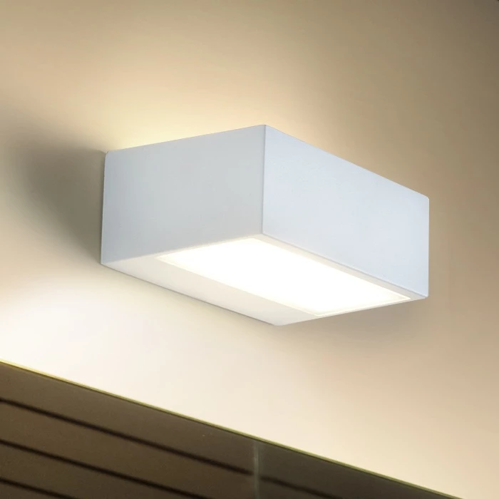Aus Aluminium in einfacher eckiger Form und in reinem weiß ist diese Leuchte mit vielen Einrichtungsstilen kombinierbar. Das helle Licht eines Halogenstabs wird durch zwei satinierte Glasscheiben diffus nach oben und unten abgegeben. Eine ansprechende Leuchte für Flure und Treppenhäuser. Auch Ihr Badezimmer können Sie mit der weißen Variante effektvoll durch indirektes Licht in Szene setzen. Die Leuchte verfügt über die Schutzart IP44, und ist damit geschützt gegen das Eindringen von festen Gegenständen, die größer als 1mm sind und gegen Wasserstrahlen aus allen Richtungen. Nutzen Sie indirekte Beleuchtung für eine lebendige Wohlfühlatmosphäre.