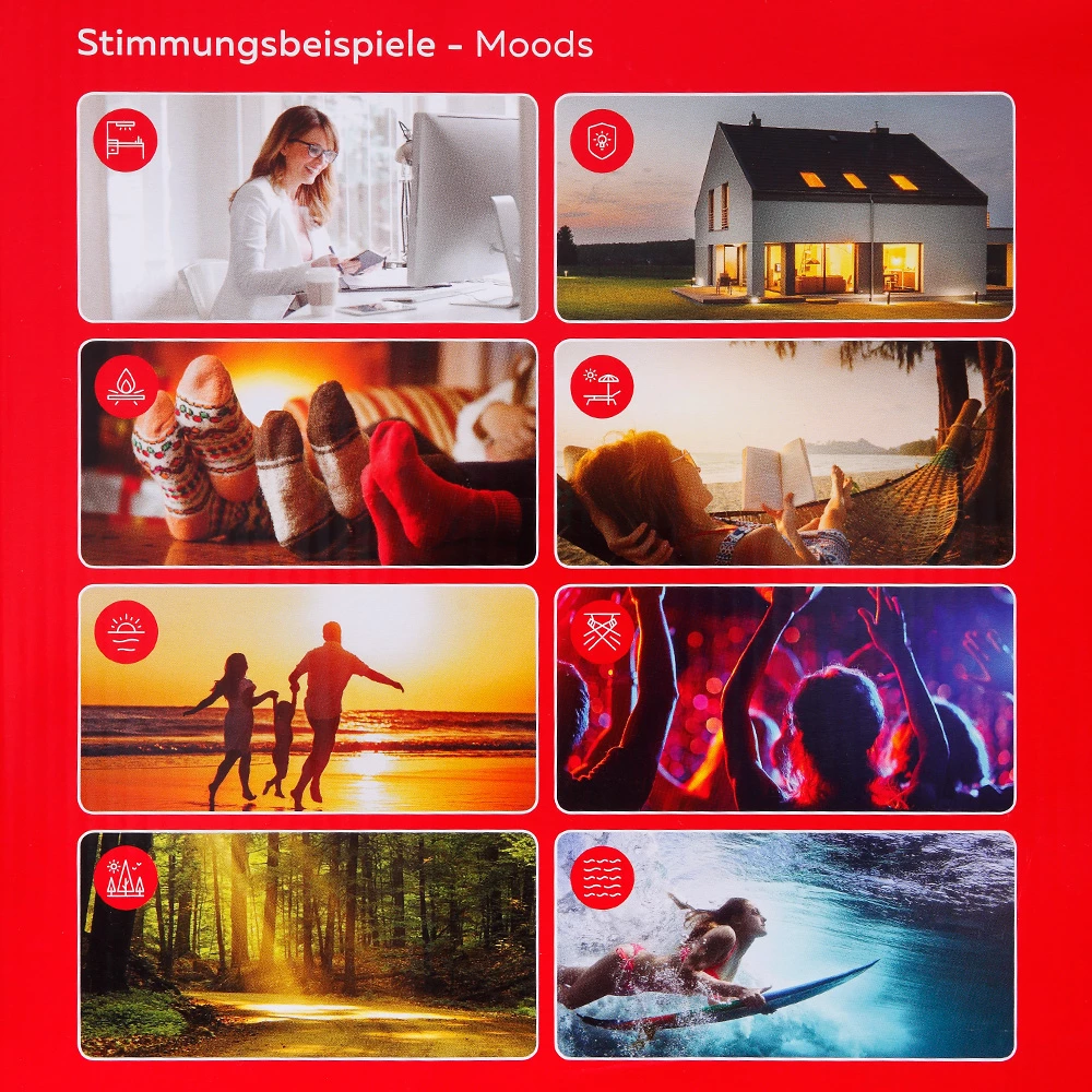 | Lichtfarbe | warmweiß extra (< 2700 Kelvin) , warmweiß (< 3.500 Kelvin) , RGB , RGBW , Verlauf , Tageslicht (> 5.300 Kelvin) |