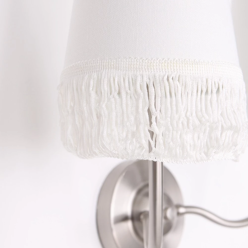 Wandleuchte in Nickel-matt mit cremefarbenen Stoffschirmen mit Bommeln
