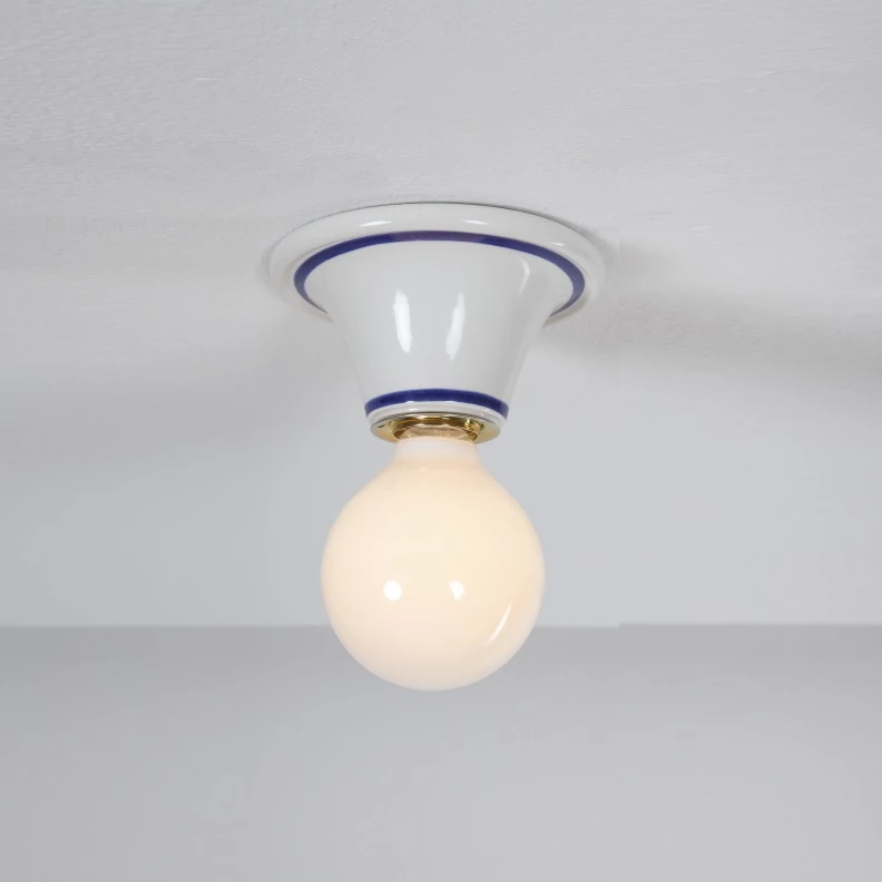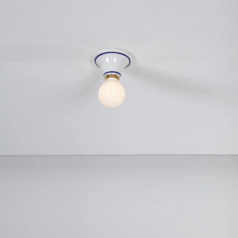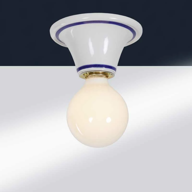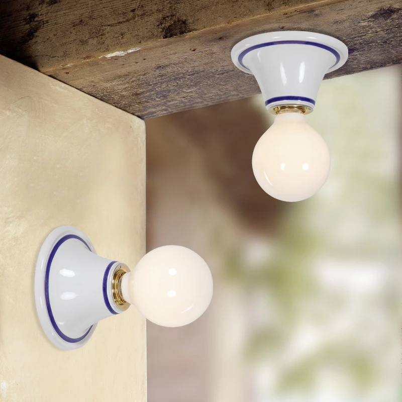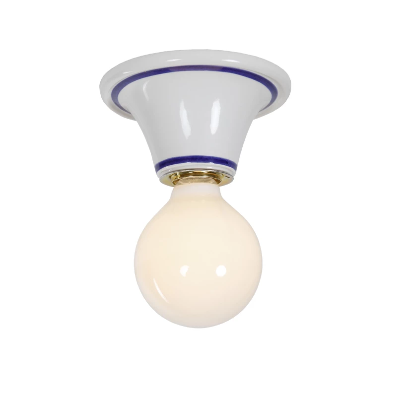 Das Design der Decken- oder Wandleuchte ist schlicht und vermittelt dennoch Gemütlichkeit und Eleganz. Unabhängig davon, welchen Stil das Ambiente trägt, können Sie die Leuchte in den klassischen und Landhausstil integrieren. Entdecken Sie die Eleganz der Keramikoberfläche mit den zarten blauen Streifen und die Möglichkeiten, die Ihnen diese Leuchte als Wand- oder Deckenleuchte bietet. Montieren Sie die Leuchte einzeln als Sololeuchte, in Reihe oder als Gruppe. Von dem starken Auftritt dieser Leuchte werden Sie begeistert sein.