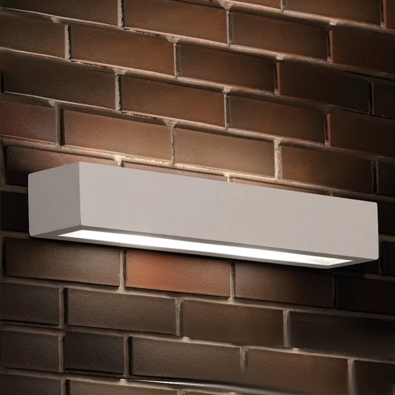 Die rechteckige Wandleuchte besteht komplett aus Gips. Oben ist sie offen und unten ist sie mit einer Glasplatte verschlossen, diese dient sowohl als Blend- als auch Staubschutz.
