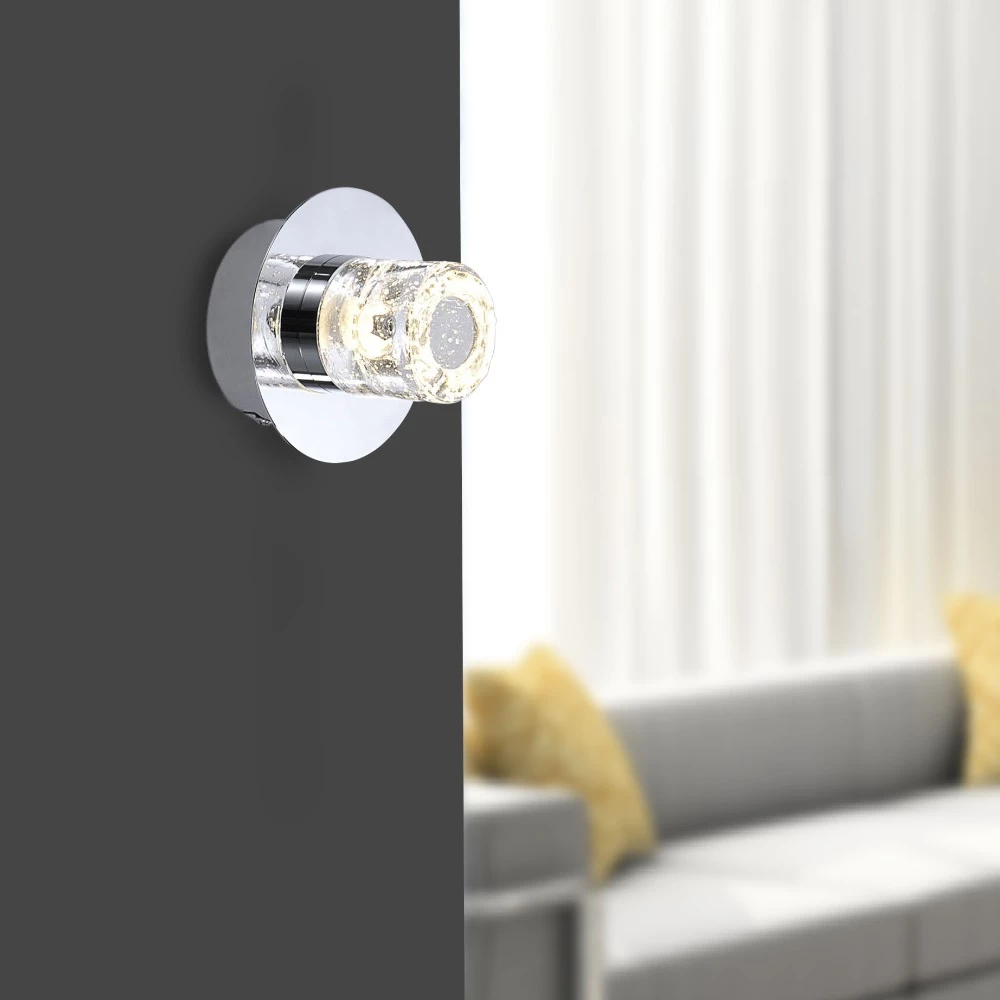 Mit ihrem schlichten, modernen Design überzeugt die aus Stahl gefertigte Wandleuchte in Chrom. Abgerundet wird das Erscheinungsbild durch das runde, klare Acrylglas mit kleinen Luftbläschen. Geliefert wird die Wandleuchte mit einem festverbauten LED- Leuchtmittel mit einer Leistung von 6 Watt. Es strahlt rund 500 Lumen aus und wirkt mit einer Farbtemperatur von 3000 Kelvin angenehm warmweiß. Aufgrund der hohen Schutzklasse IP44 ist diese Wandleuchte auch für den Einsatz in Ihrem Badezimmer problemlos geeignet.