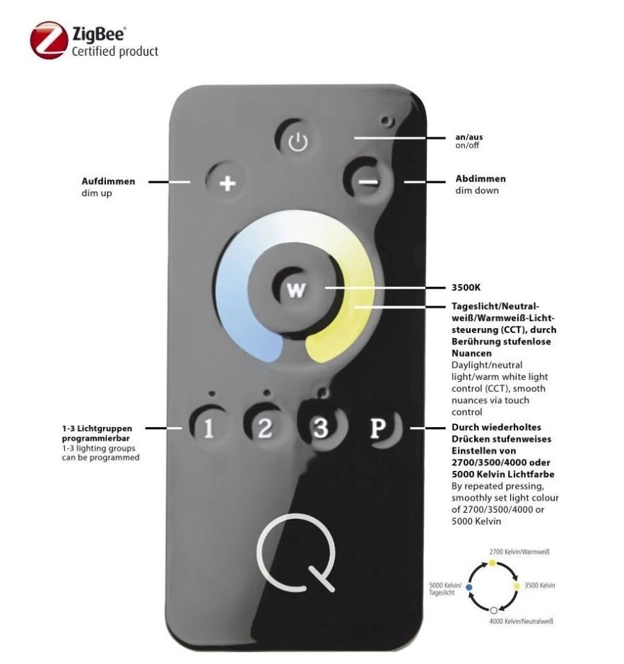 | Besonderheiten | Intelligente Lichtsteuerung per Fernbedienung – ZigBee , Smart Home , ZigBee kompatibel |