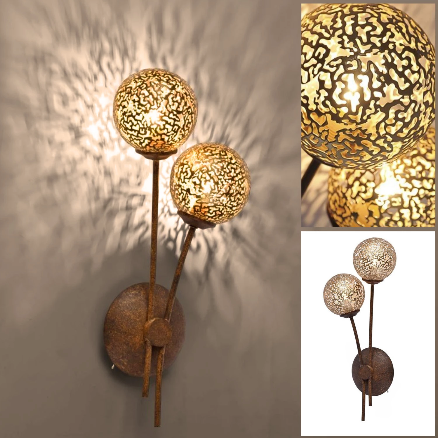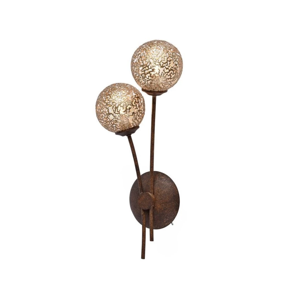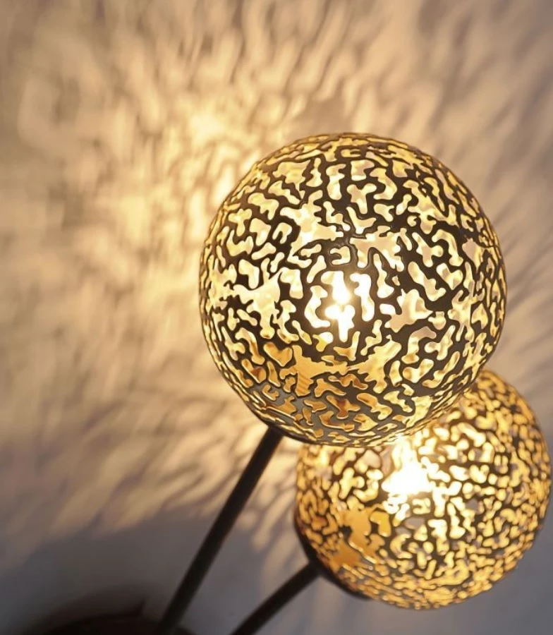 Die Leuchte besteht aus braun lackiertem Stahl und goldfarbigen Leuchtkugeln mit einem lichtdurchlässigen Muster.