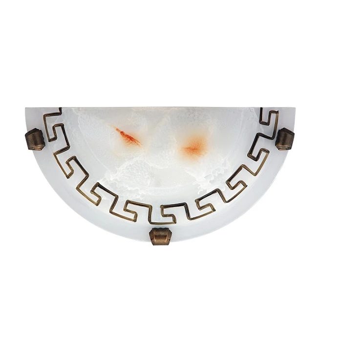 Ein auffallendes Mäander-Band Muster schmückt diese Wandleuchte mit Alabasterglas. An bronzefarbenen Krallenhalterungen wird das Glas befestigt. Durch die leichte Färbung erhält man ein blendfreies und angenehmes Licht.