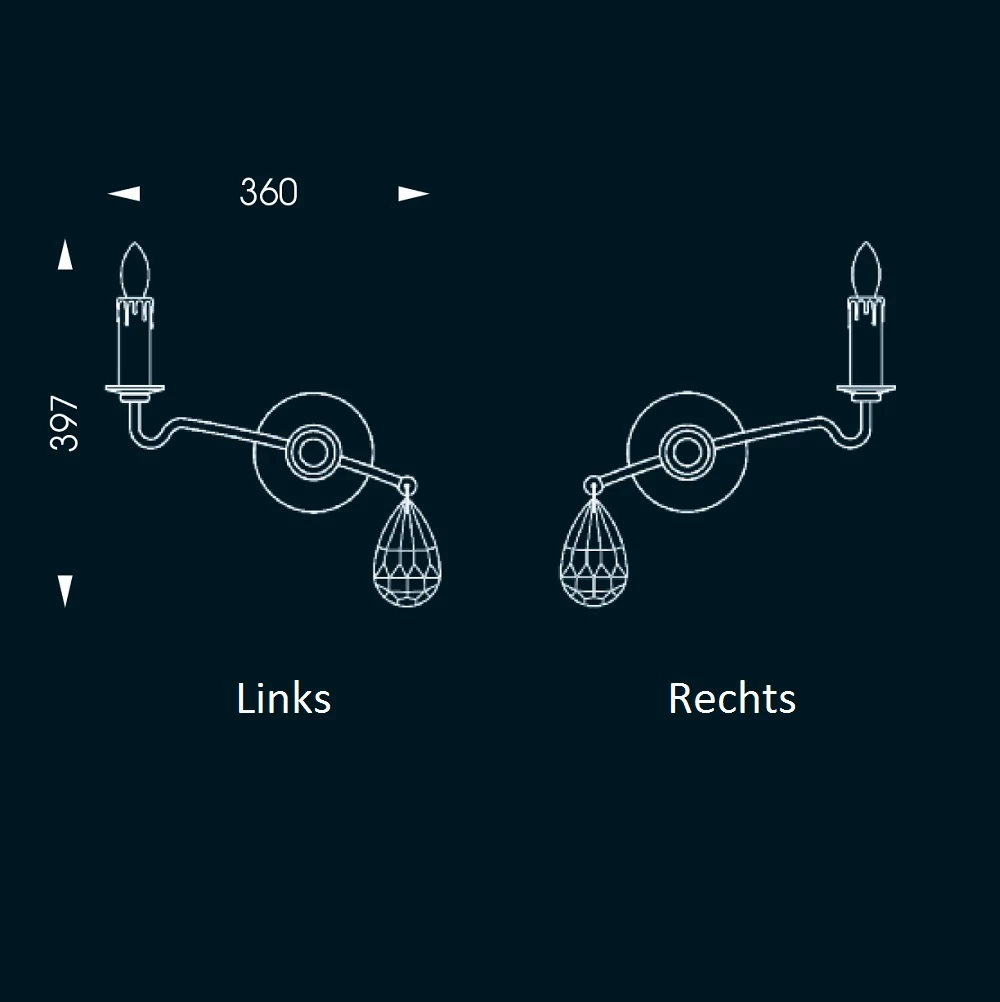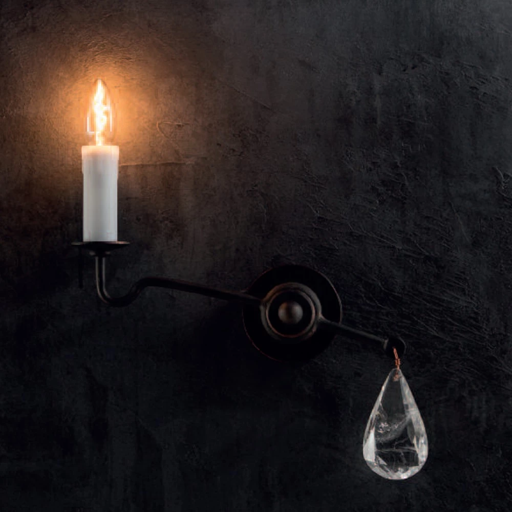 Sie besteht aus einer runden, handgeschmiedeten Scheibe, die für die Wandbefestigung genutzt wird. Von dieser führen zwei seitliche Stäbe schräg nach oben und unten. Der obere Stab mündet in einem Kerzenhalter, auf dem das kerzenförmige Leuchtmittel platziert ist. Der untere Stab ist mit einer Öse versehen. An dieser hängt ein Bergkristall, dessen Tropfenform durch einen raffinierten Facettenschliff noch attraktiver wirkt.