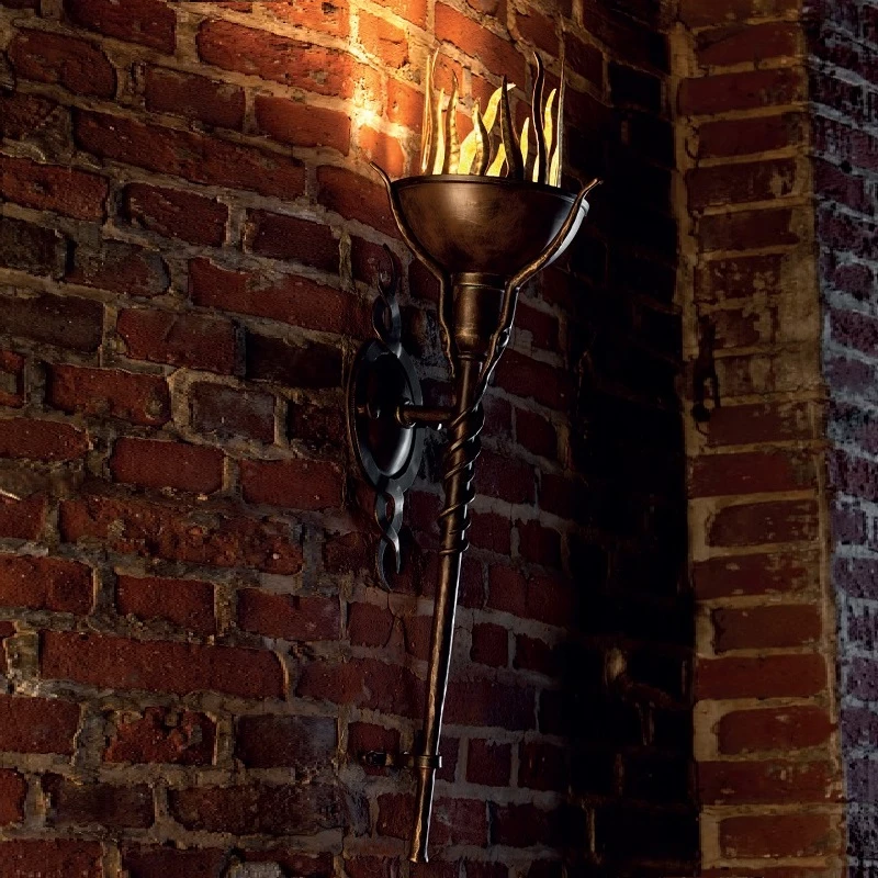 Stilgetreu flackern vergoldete Flammen aus dem Leuchtenkelch hervor, das ganze Design der Wandleuchte besteht aus einem handgefertigten Schmiedeeisen und wurde mit einer Patina Lackierung veredelt. Doch nicht nur die Ritterrunden auf Burgen und Schlösser erhalten mit dem indirekten Licht dieser Wandleuchte eine angenehme Beleuchtung, an den Fassaden landhausstil-getreuer oder klassischer Bauten ist sie ebenso eine perfekte Ergänzung.