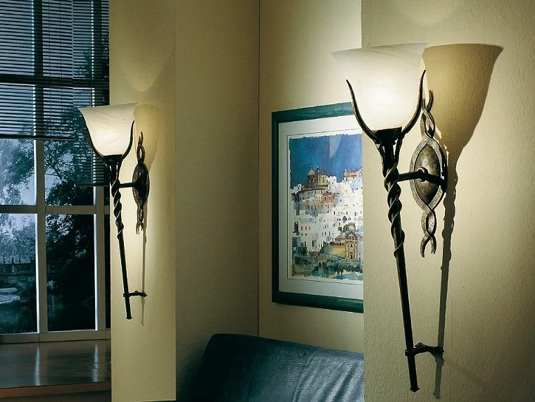 Die wunderschöne Wandfackel aus massivem Schmiedeeisen, mit der Oberfläche in patina, ist besonders durch ihr Glas und ihre Form neben Spiegeln oder Bildern dekorativ. Das Glas ist hochwertiges italienischem Papyrus-Glas.