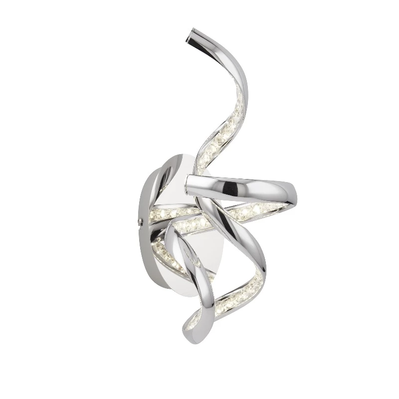Die Leuchtenarme der Wandleuchte wirken wie Schleifenband. Außen verchromt, innen mit Glaskristallen versehen sorgen sie für ein brillantes Lichtspiel.