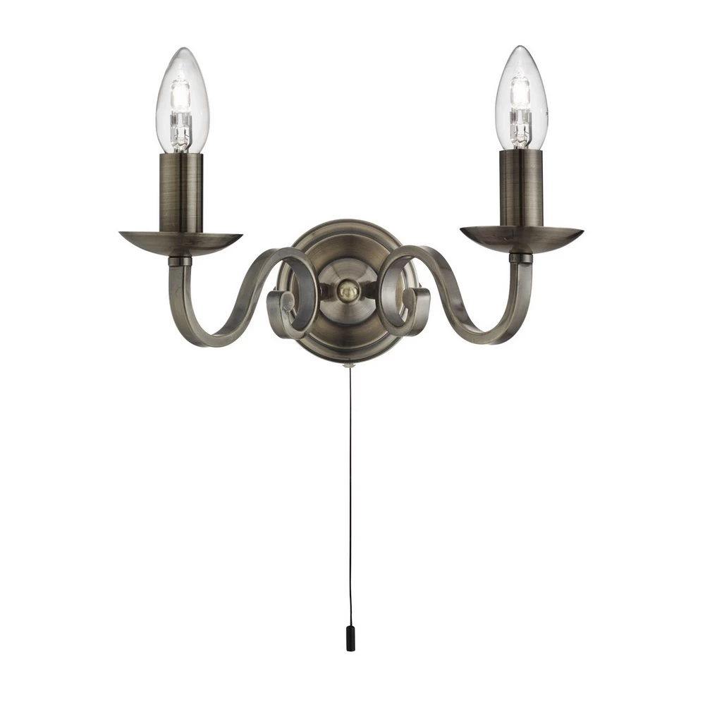 Der Leuchtenkorpus ist traditionell geformt und zeigt zwei schön gebogene Leuchtenarme, die in Metalltellern enden, die wiederum die klassischen Leuchtmittel in Kerzenform tragen. An der detailreichen Wandhalterung ist ein praktischer Zugschalter installiert. Alter Landadel und klassische Eleganz ist die Inspiration dieses Wandleuchters.