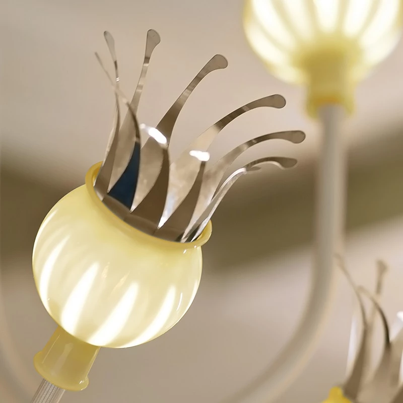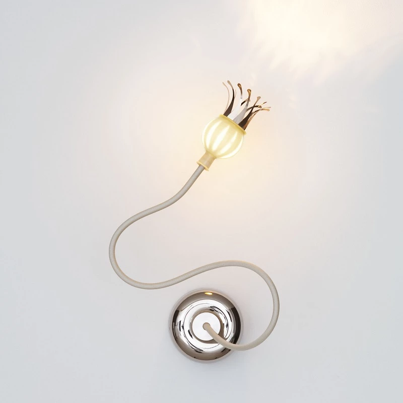 Wird die ‘‘Mohnblüte‘‘ dieser Leuchte durch Einschalten geweckt, öffnet sich ihr Schirm ganz allmählich innerhalb 2 Minuten: dafür verantwortlich sind die feinen Blätter aus Bi-Metall, die sich durch Erwärmung des Leuchtmittels in eine vorgegebene Richtung ausdehnen. Ihre Knospe, der kelchartige Schirm aus mundgeblasenem Glas erhält durchleuchtet eine feine Transparenz.