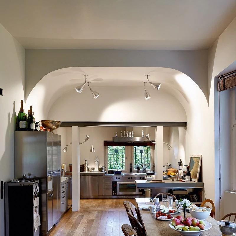 Schlicht und auf das Wesentliche reduziert passt sich der Strahler One Eighty jeder Raumsituation an und kann sowohl an der Decke wie an der Wand platziert werden. Sein gerichteter Lichtstrahl bewirkt eine punktuelle Beleuchtung, mit der bestimmte Bereiche oder dunkle Ecken direkt angestrahlt werden können. In Verbindung mit den verschiedenen Verstellmöglichkeiten – drehbar um 350° und um 90° kippbar – erreicht das Licht des Strahlers jeden Punkt im Raum.