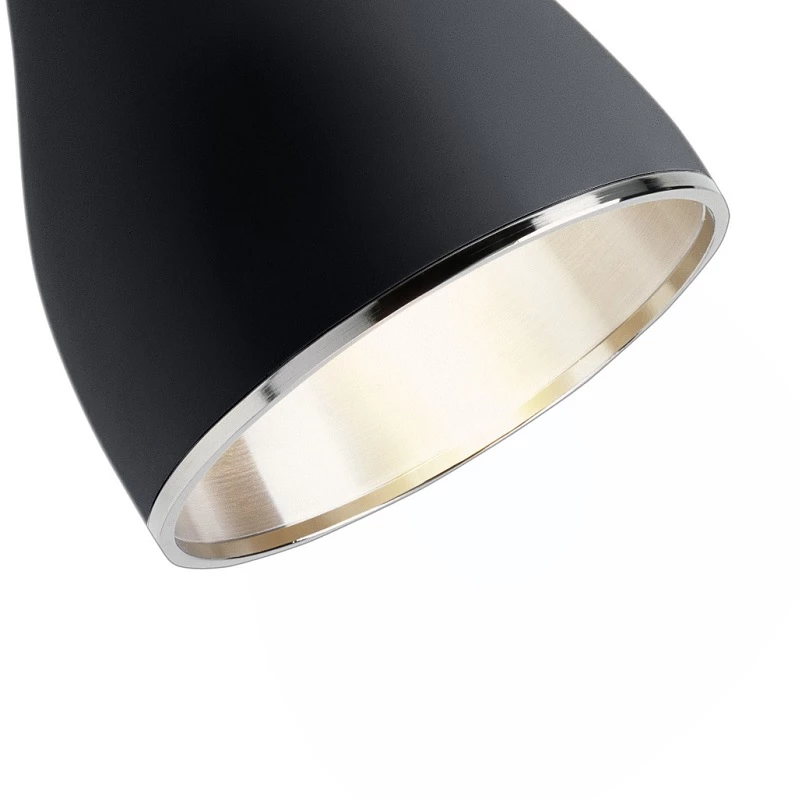 Der Strahler besteht aus einem schwarz lackierten Aluminium, vernickelte Zierringe und das silberne Dreh-/Kippgelenk komplettieren das schicke und moderne Design. Erhältlich ist der Strahler in zwei Größen und wird mit einem runden Deckenbaldachin geliefert.