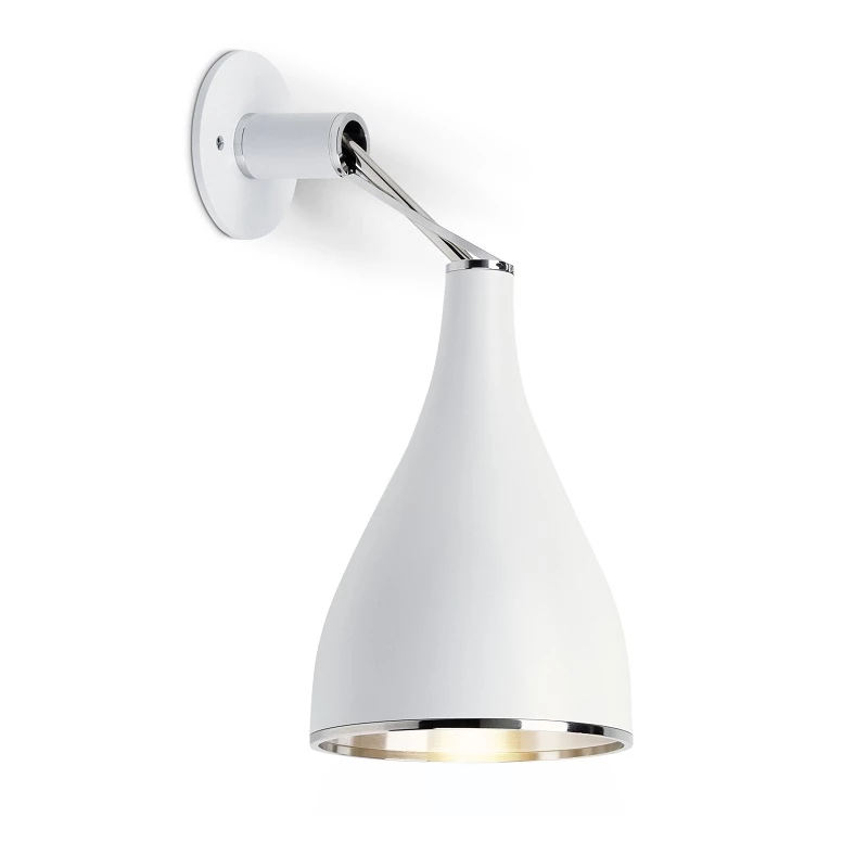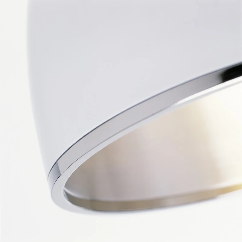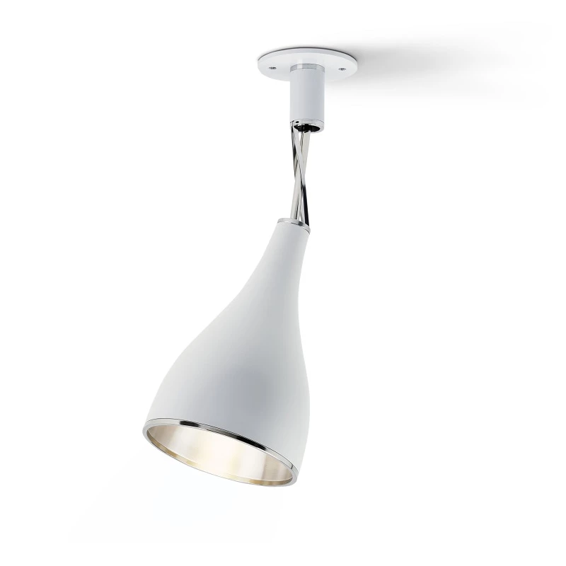Der Strahler besteht aus einem weiß lackierten Aluminium, vernickelte Zierringe und das silberne Dreh-/Kippgelenk komplettieren das schicke und moderne Design. Erhältlich ist der Strahler in zwei Größen und wird mit einem runden Deckenbaldachin geliefert.