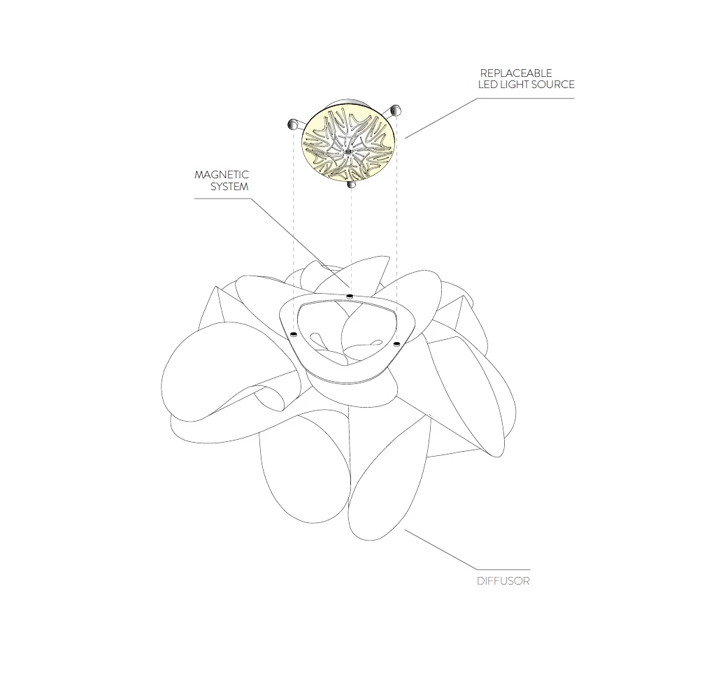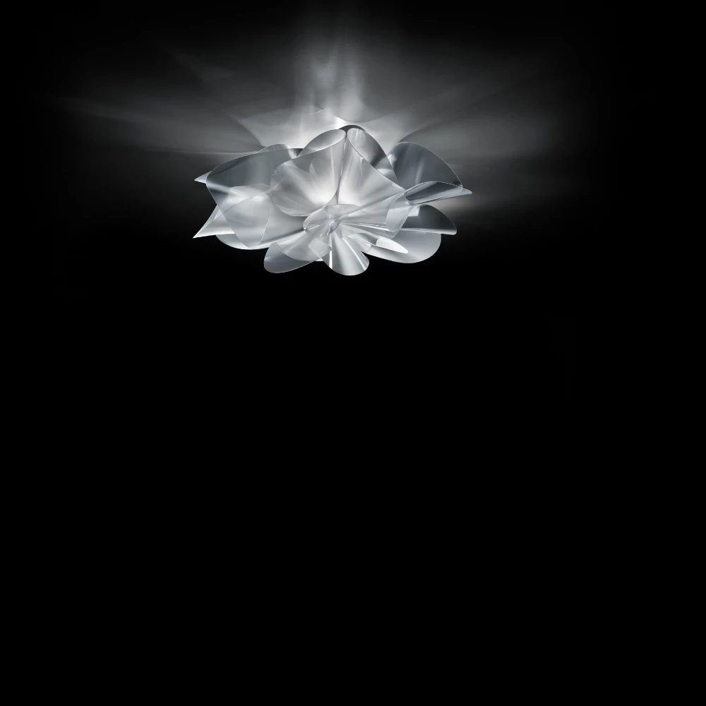 Mit Leichtigkeit und erhabener Eleganz befreit sie sich in der Luft und lässt ihr ganzes Licht ausströmen, das als Verbündeter der Materie aus dem Herzen kommt und die entferntesten Oberflächen der Leuchte erreicht, wodurch es im Raum eine Explosion von Energie und Theatralik verbreitet.