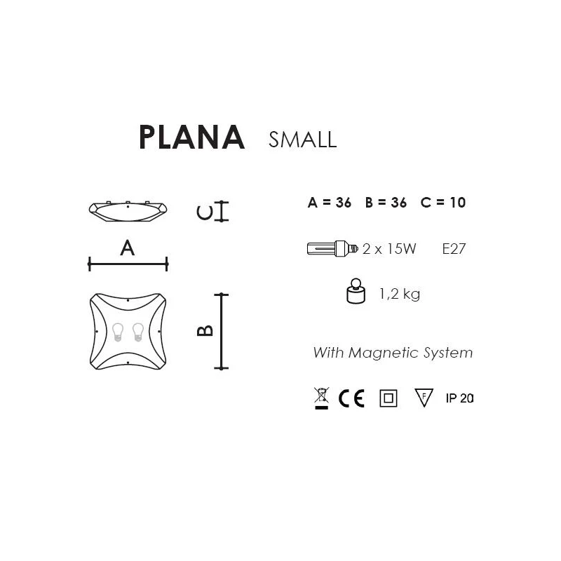 - Plana Venti Small: 36cm x 36cm, Höhe: 10cm – Leuchtmittel: 2x E27 60W – mit Magnet-System